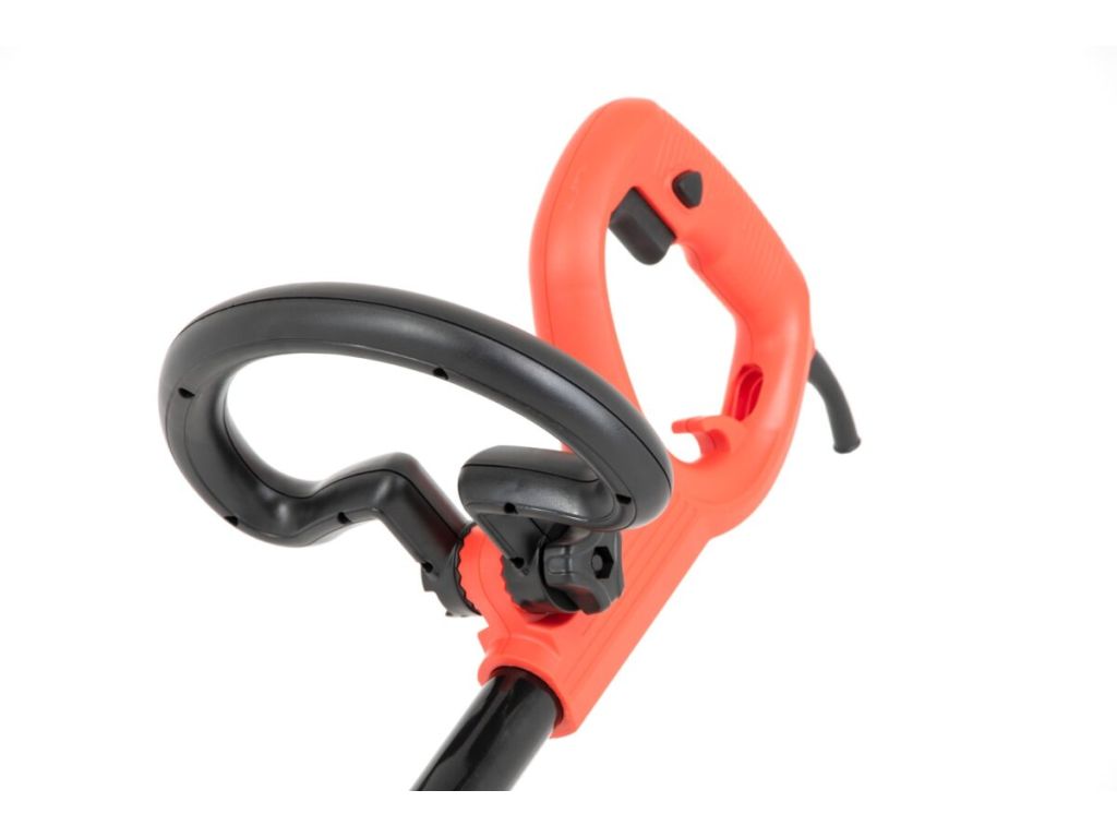 Комфорт работы обеспечивается регулируемой вспомогательной ручкой, возможностью регулировки глубины среза, небольшим весом, кроме того, кусторез очень устойчив и легок в управлении благодаря большим размерам задних колес.