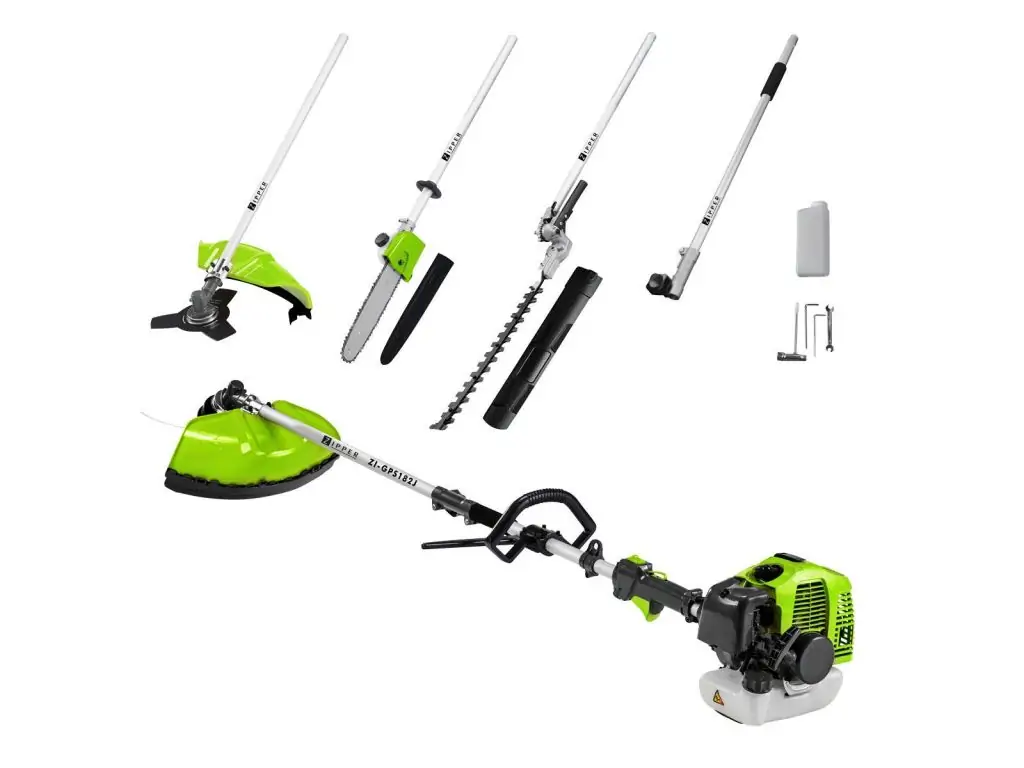 Садовый набор Zipper ZI-GPS182J – это универсальная комбисистема по уходу за садом и приусадебным участком, которая состоит из универсальной ручки, таких насадок, как триммер, садовые ножницы, пила и кусторез, и ремня через плечо. Насадки легко и быстро крепятся на основе и так же легко снимаются. Оборудование работает на базе двухтактного бензинового двигателя мощностью 1650 Вт с оборотной скоростью 9000 об/мин. Объем топливного бака 1,1 л позволяет длительно работать без дозаправки.