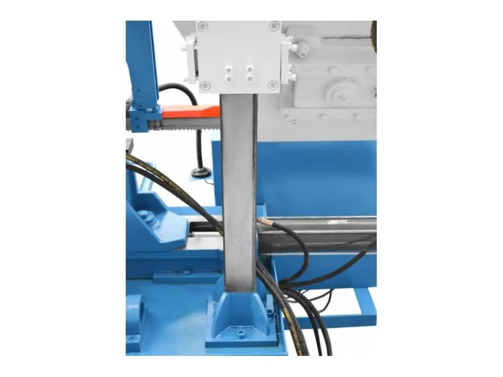 Гидравлическое натяжение ремня позволяет получить оптимальные условия работы ремня. Если пила ломается, машина останавливается автоматически. Точность направления ленты обеспечивают направляющие, состоящие из подшипников и вставок из спеченного карбида. Подвижная головка, направляющая ленту, устанавливается в зависимости от размеров разрезаемого материала, что повышает стабильность и точность работы ленты.