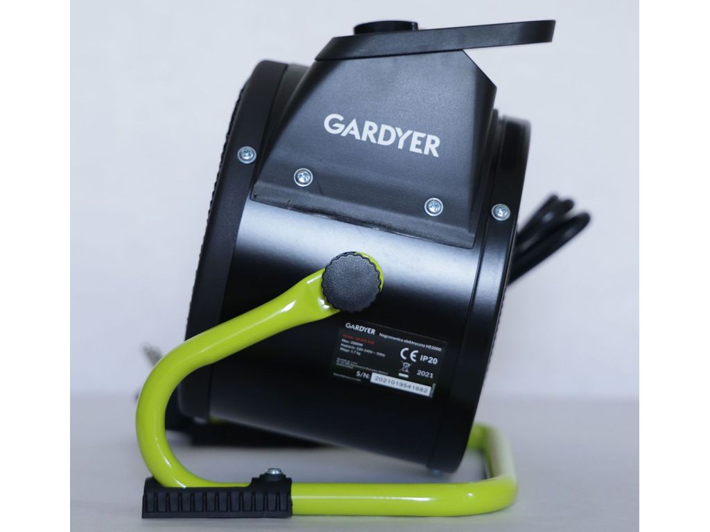 Электрический отопитель Gardyer HE2000 нагревает воздух и распределяет его по комнате с помощью вентилятора внутри. Аппарат имеет мощность 2 кВт.
