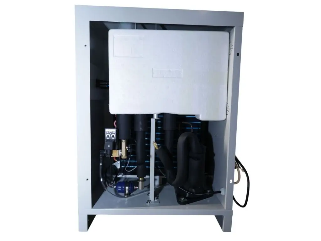В основе работы осушителя рефрижераторного типа - охлаждение сжатого воздуха до температуры ниже точки конденсации влаги. После этого конденсат удаляется через дренажную систему, а сжатый воздух нагревается до комнатной температуры и подается на выход.
