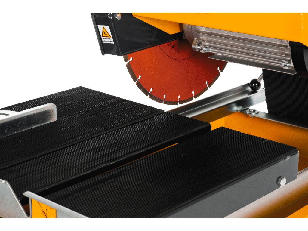 Роликовый рабочий стол с резиновой накладкой обеспечивает стабильность и точность распила. Ножки станка изготовлены из квадратной металлической трубы, могут складываться и сниматься. Станок поставляется с отрезным алмазным диском 350х30 мм, обеспечивающим четкую и ровную линию реза. Система водяного охлаждения предотвращает перегрев диска и заготовки и уменьшает количество пыли. Чтобы купить электрический камнерез Lumag STM 350-800, переходите в наш интернет-магазин.