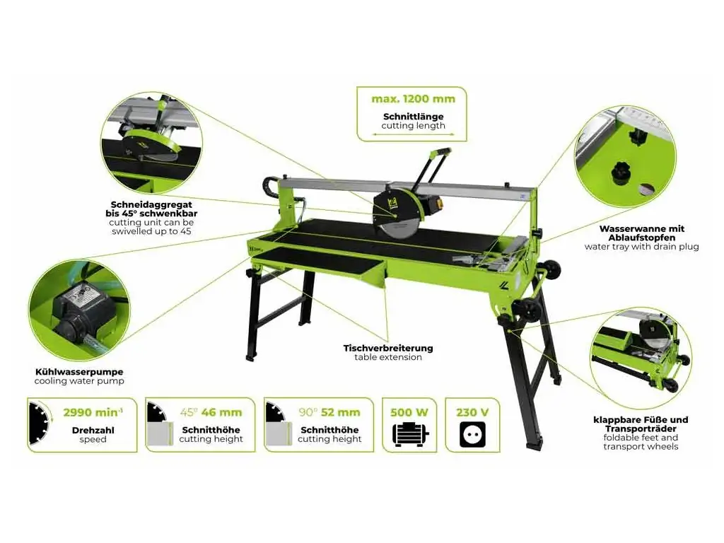 Плиткорезный станок Zipper ZI-FS250-1200 предназначен для сухой и мокрой резки всех видов плитки толщиной до 52 мм. Максимальная длина реза составляет 1200 мм. Поворот режущего блока до 45° позволяет удобно выполнять угловые резы. Оснащен двигателем мощностью 1,2 кВт с питанием от напряжения 230 В.
