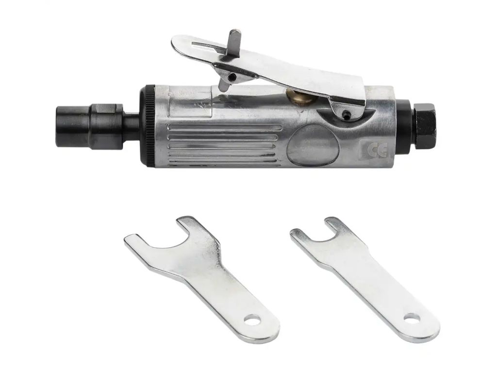 Диаметр входного отверстия - ¼", минимальный диаметр шланга - 10 мм. 2 быстросменных наконечника, 3 мм и 6 мм, позволяют использовать машину с широким спектром различных инструментов. Благодаря компактной конструкции с длиной корпуса 152 мм и небольшому весу, эта пневмошлифмашинка для автосервиса удобная в эксплуатации и не утомляет руки.
