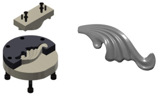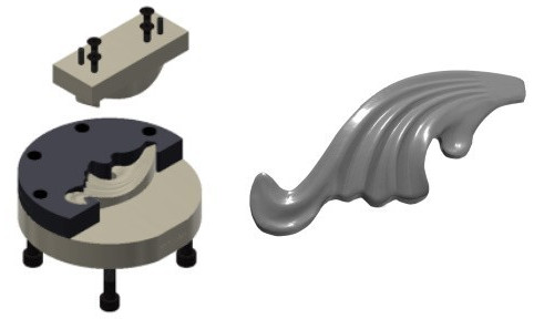 Матрица для изготовления всех видов плоских заготовок с закругленным концом без или с отверстием, прямых, круглых. Часто используется в качестве зажимов, опорных стоек и т. Д. Начиная с полосы металла, деталь желаемой длины выходит из матрицы при каждом ударе.