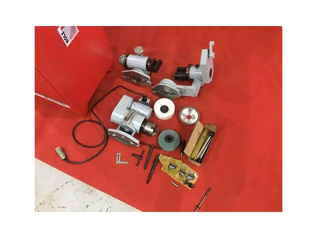 Комплект поставки: Опорная рама, задняя бабка справа и слева, пружинный упор, регулируемые упоры стола, устройство для заточки винтовых свёрл, приводной узел с 3-кулачковым патроном 80 мм, стандартный центр 60°, срезанный центр 60°, 1 чашечный шлифовальный круг и 1 алмазный чашечный круг (125 x 35 x 32 мм), 1 заточной круг прямого профиля и 1 тарельчатый круг (125 x 15 x 32 мм), держатель токарного резца, зажимная оправка для фрезы 16, 22, 32 мм, инструмент для технического обслуживания.