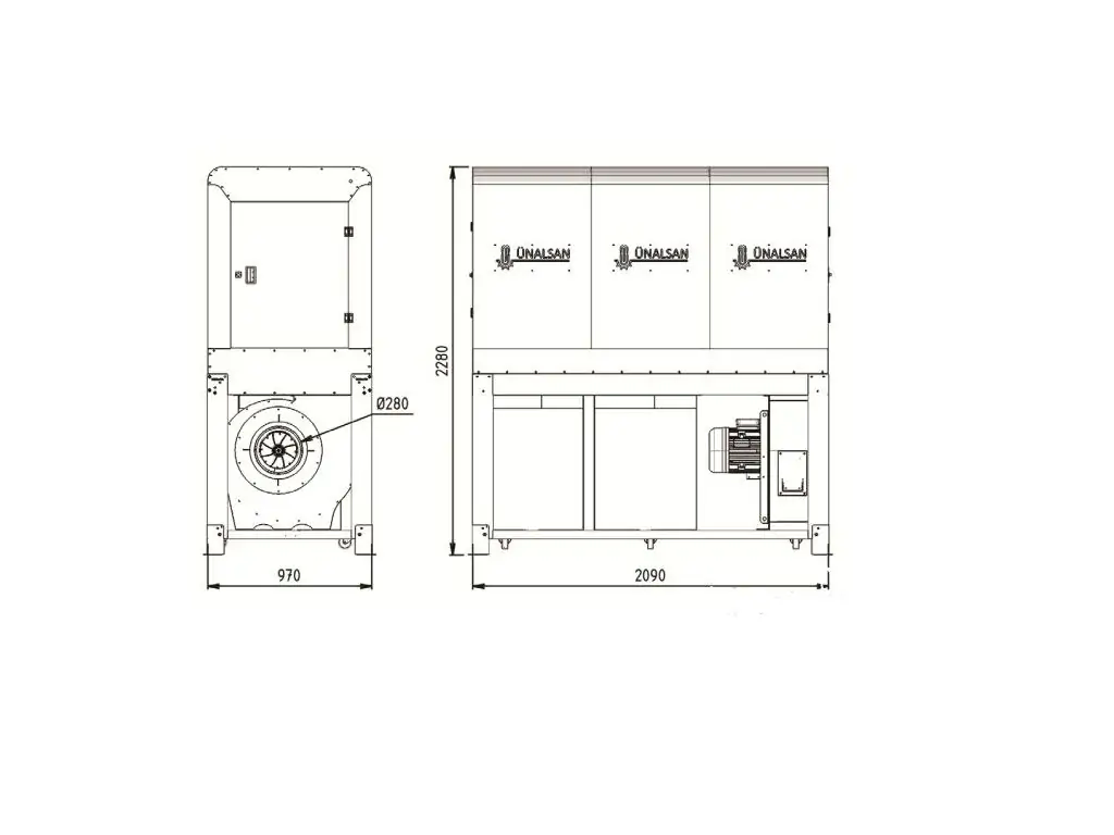 Корпус аспирационной установки полностью закрыт металлическим кожухом, где все стыки листового металла герметизированы силиконом. Это позволяет использовать установку не только внутри цеха, но и на улице. При наружной установке аспирации, в верху кожуха есть технологические отверстия для подсоединения воздуховодов, для возврата отфильтрованного теплого воздуха назад в производственный цех.