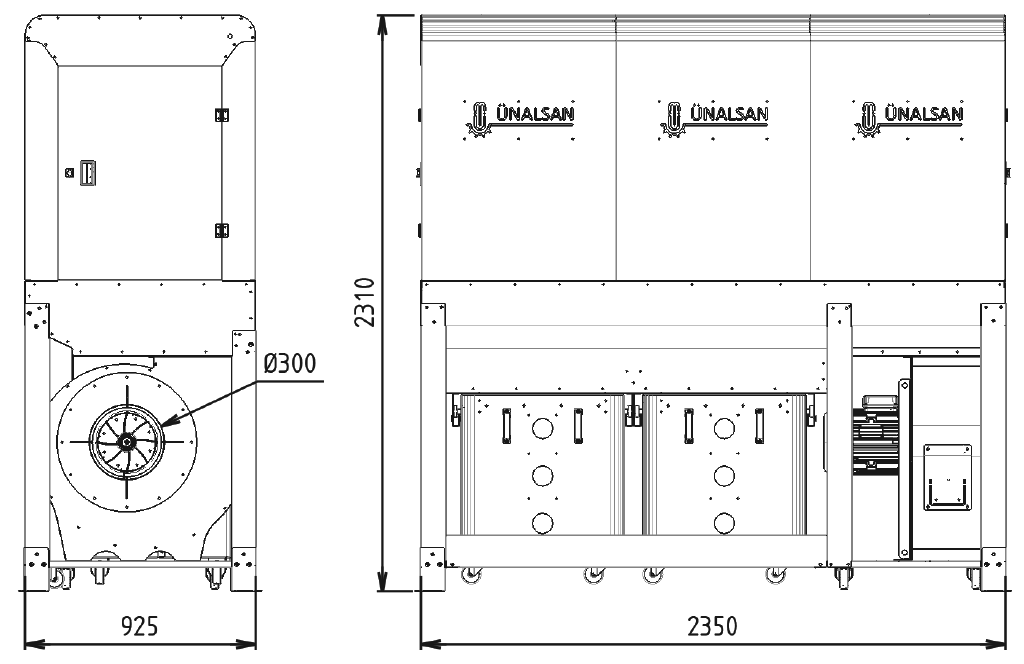 Корпус аспирационной установки полностью закрыт металлическим кожухом, где все стыки листового металла герметизированы силиконом. Это позволяет использовать установку не только внутри цеха, но и на улице. При наружной установке аспирации, в верху кожуха есть технологические отверстия для подсоединения воздуховодов, для возврата отфильтрованного теплого воздуха назад в производственный цех.