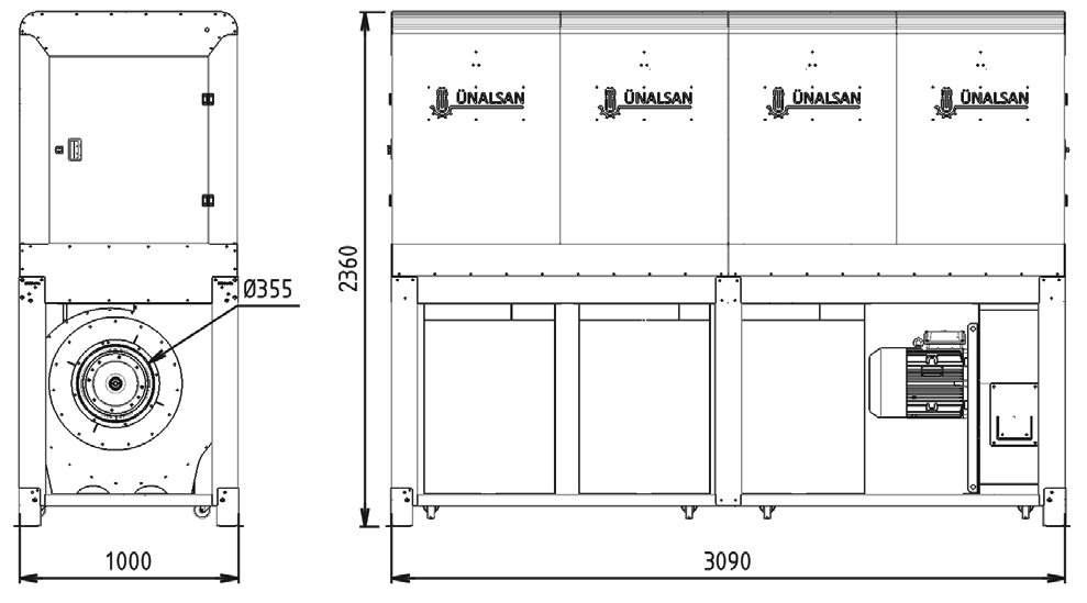 Корпус аспирационной установки полностью закрыт металлическим кожухом, где все стыки листового металла герметизированы силиконом. Это позволяет использовать установку не только внутри цеха, но и на улице. При наружной установке аспирации, в верху кожуха есть технологические отверстия для подсоединения воздуховодов, для возврата отфильтрованного теплого воздуха назад в производственный цех.