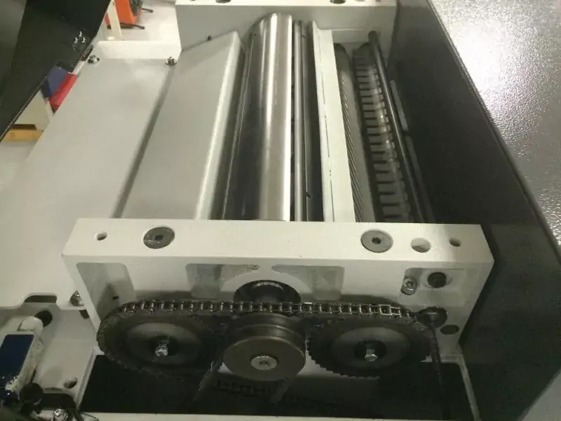 В зоне входа установлены антивозвратные пальцы — свободно подвешенные металлические пластины, пропускающие заготовку вперед, но не дающие ей двигаться назад при заклинивании ножей.