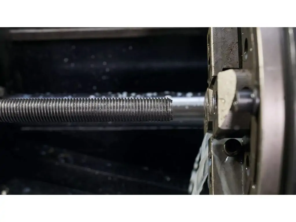 Шпиндель установлен на прецизионных подшипниках и рассчитан на значительные осевые нагрузки, что обеспечивает плавный ход без биения. Плавающий резьбонарезной патрон с осевой и радиальной компенсацией обеспечивает автоматическое подстраивание подачи под шаг резьбы, что компенсирует небольшие погрешности. Также этот резьбонарезной станок для арматуры оснащен системой ограничения длины резьбы, что позволяет выполнять повторяющиеся одинаковые резьбовые хвосты без измерения для каждой заготовки.