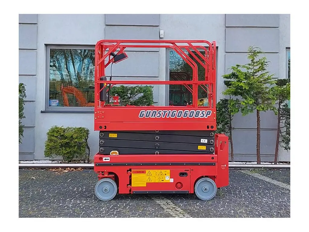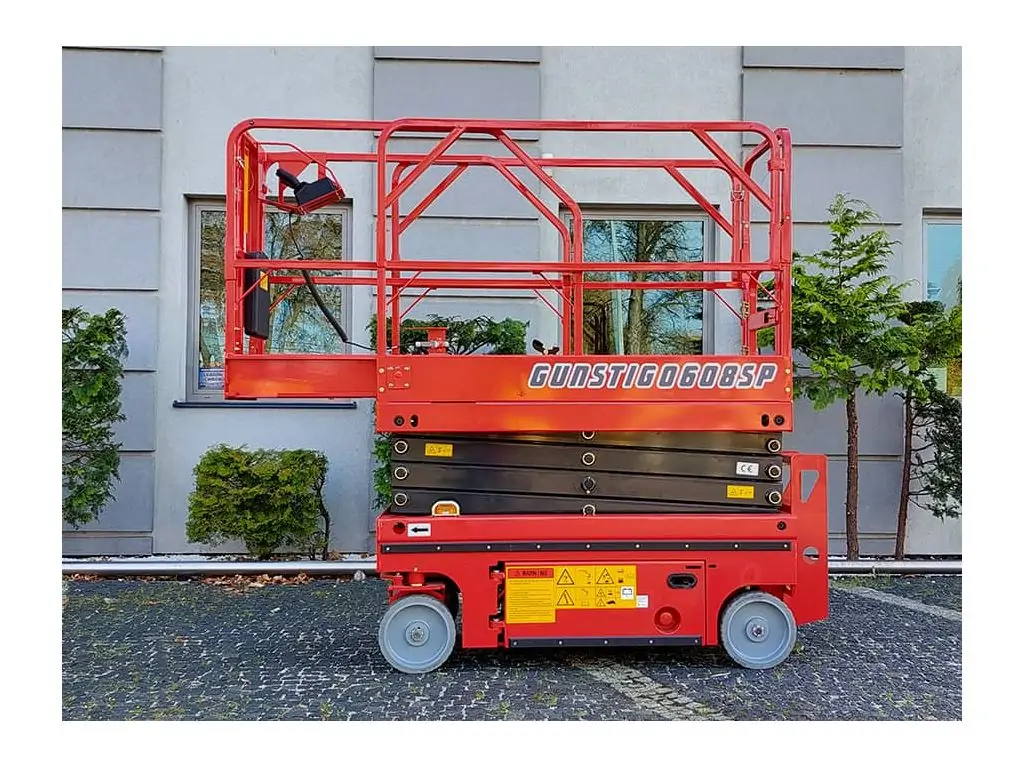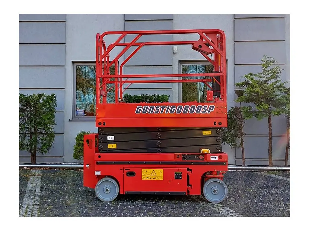 Ножничный подъемник Günstig 0608SP предназначен для подъема людей и оборудования на строительстве, в складах и других сферах, где необходимо выполнение работ на высоте. Размер подъемной платформы – 1670x740 мм. Высота платформы – 5,8 м, рабочая высота – 7,8 м. Рассчитан на 2 операторов или на максимальную нагрузку 230 кг. Для увеличения рабочей зоны есть выдвижная платформа длиной 900 мм, грузоподъемность которой составляет 113 кг.