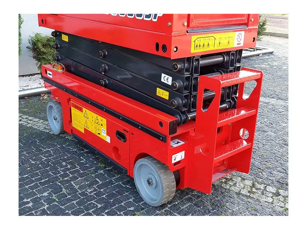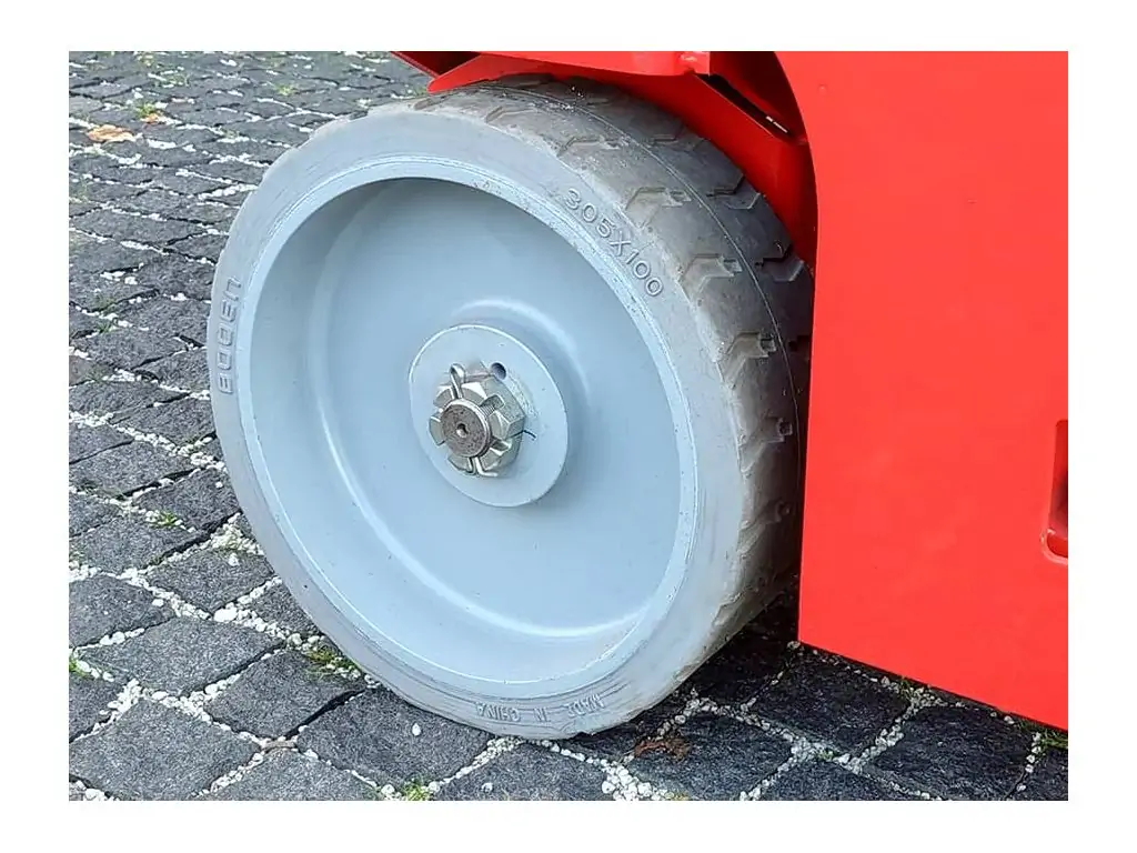 Оснащен электроприводом и 4 аккумуляторами 6V/190Ah, обеспечивающими питание всех функций подъемника. Для зарядки аккумуляторов есть встроенное зарядное устройство 24 В/25 А, подключающееся к сети 230 В. Резиновые колеса 305х100мм и 2WD привод обеспечивают плавное движение и позволяют работать на склонах до 25%. Управляется этот подъемник строительный с помощью джойстика.