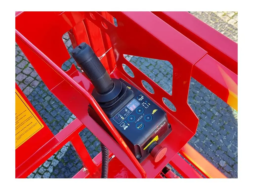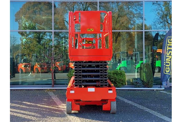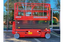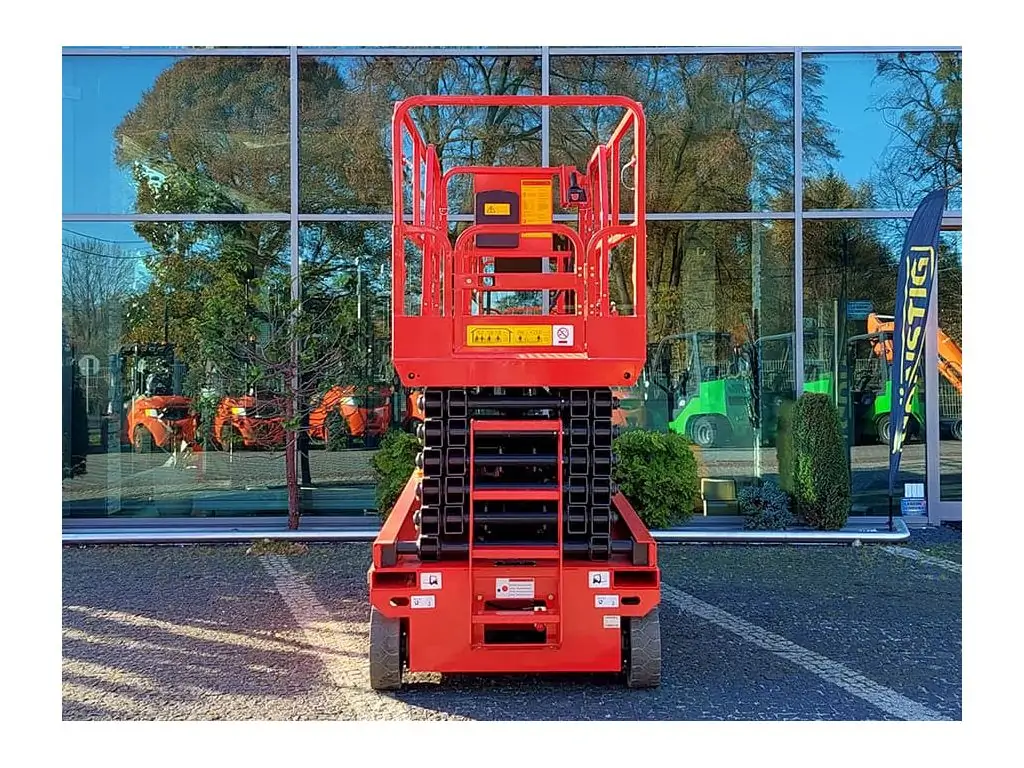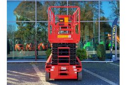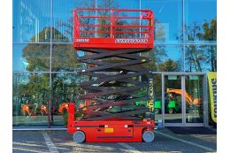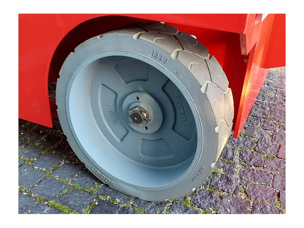 Подъемник оснащен электроприводом с питанием от 4 свинцово-кислотных аккумуляторных батарей 12V/135 Ah. Для зарядки аккумуляторов есть встроенное зарядное устройство. За счет небольшого радиуса разворота (2,2 м) эта высотная платформа электрическая отлично подходит для работы в ограниченном пространстве.