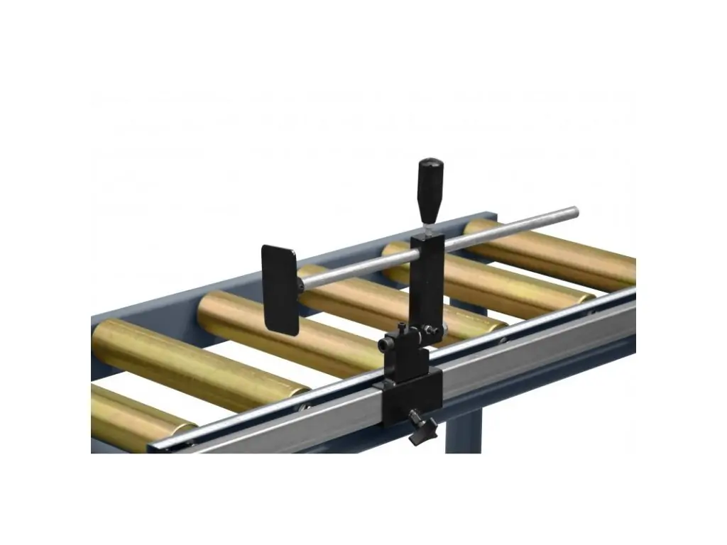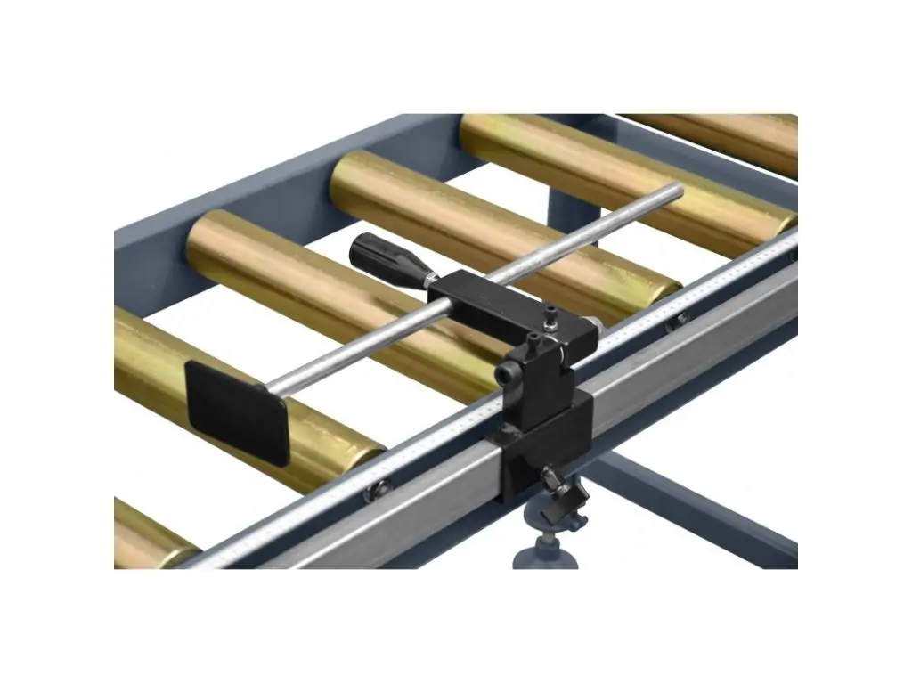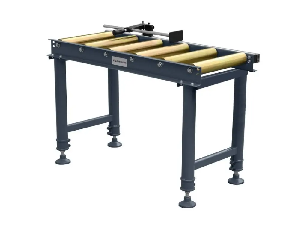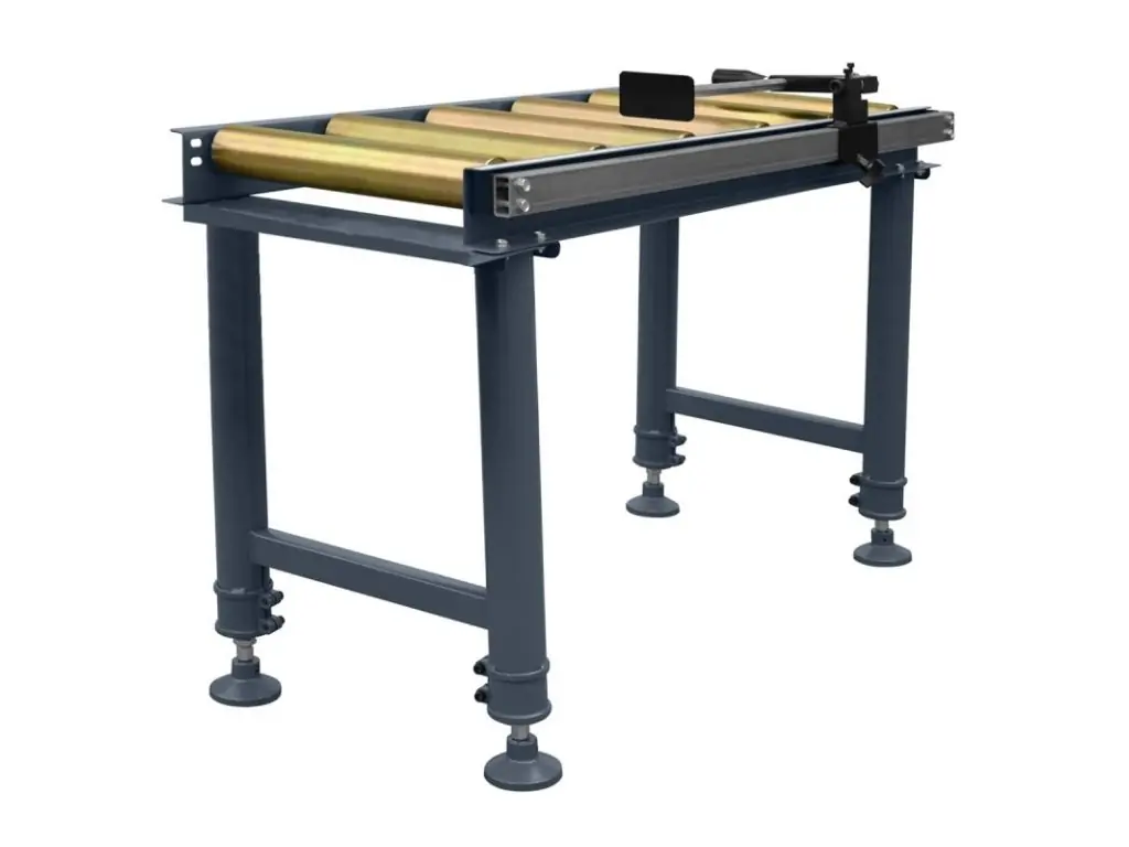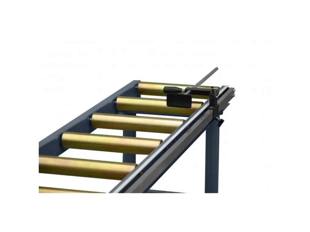 Роликовый конвейер с регулируемой высотой. Для подачи и сбора обрабатываемого материала. Имеет линейку для измерения длины реза.