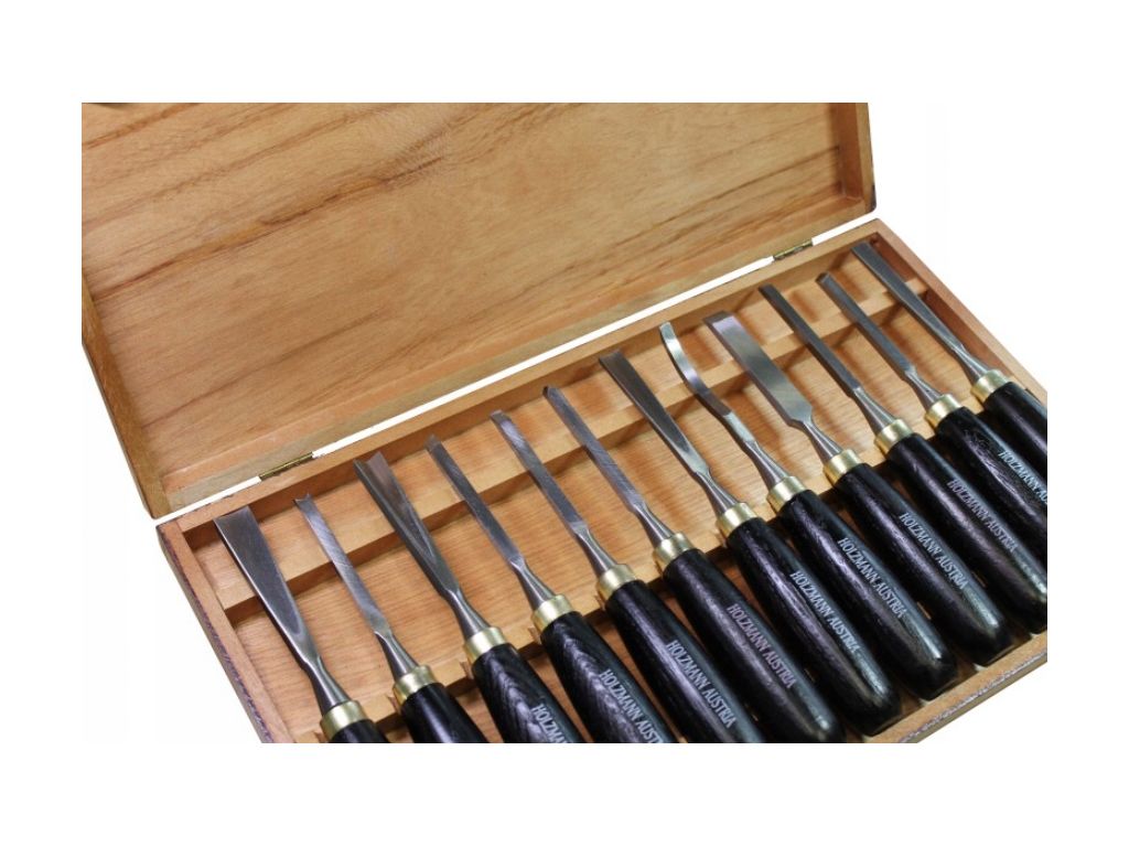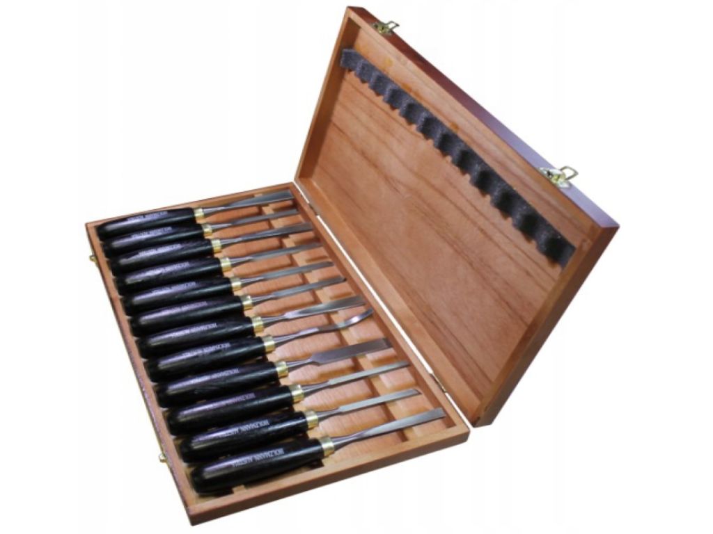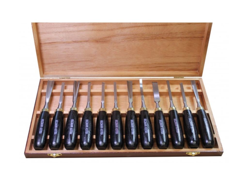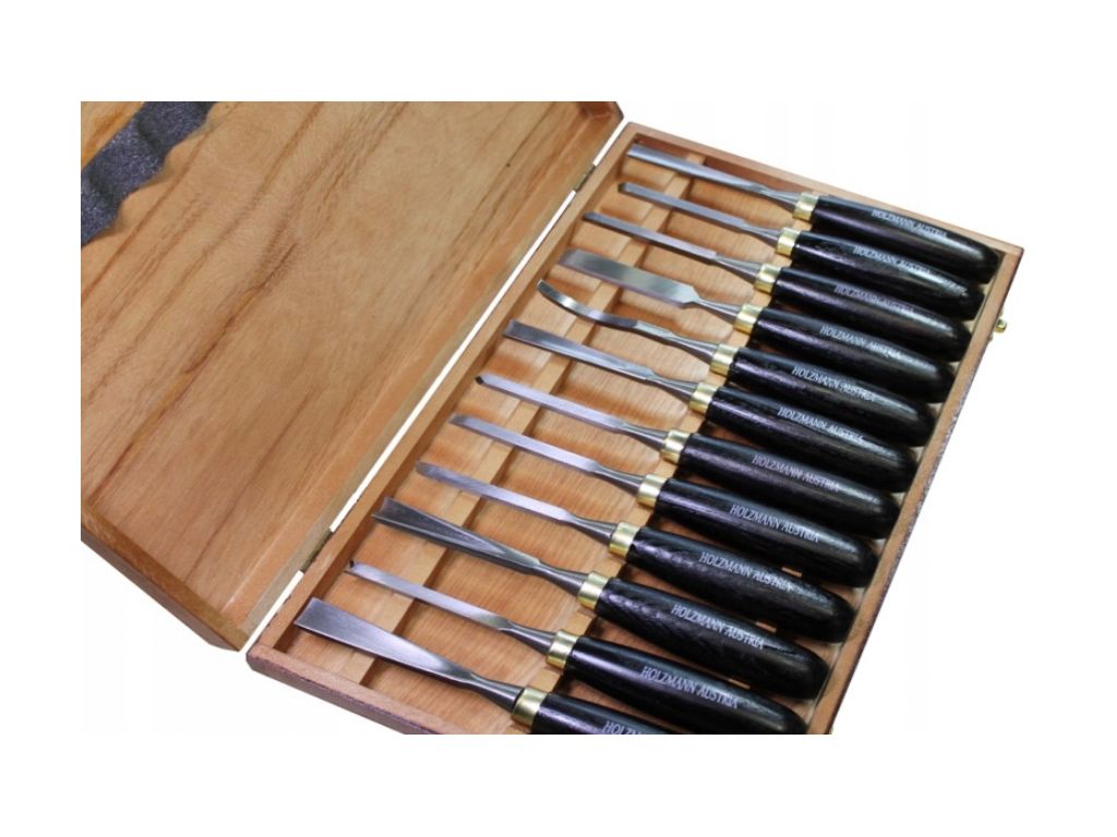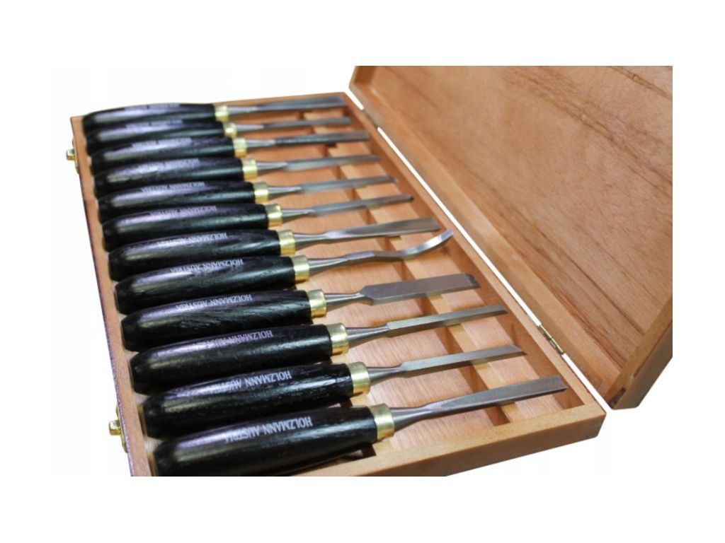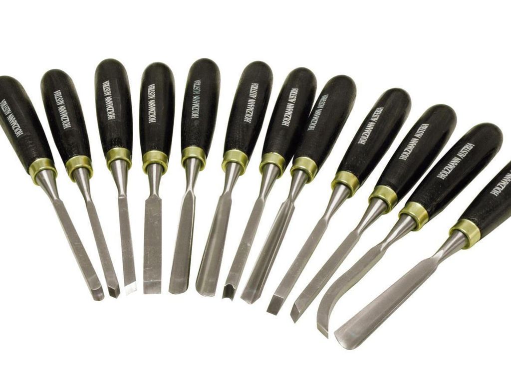 например, плоский резец шириной 12 и 6 мм, пустотелое долото шириной 16, 12 и 10 мм, V-образный резец шириной 16 мм, ширина остальных резцов составляет около 6 мм.;