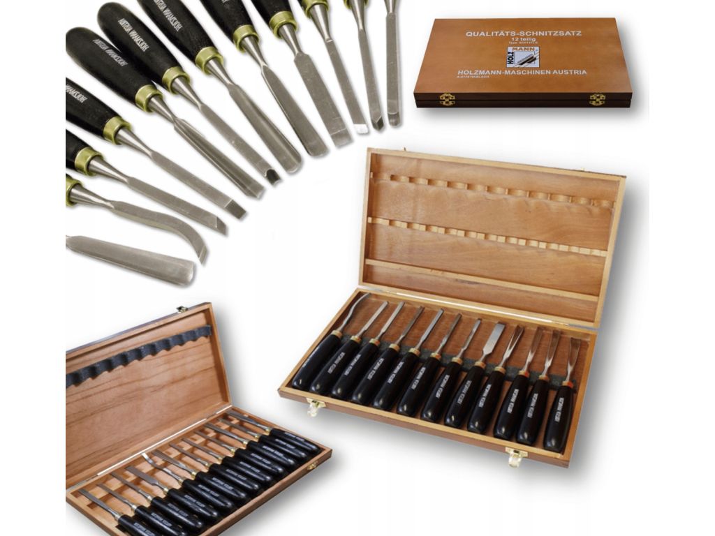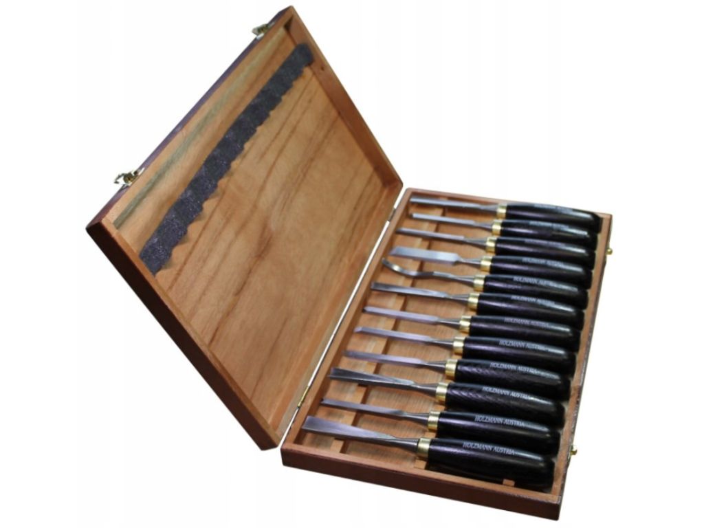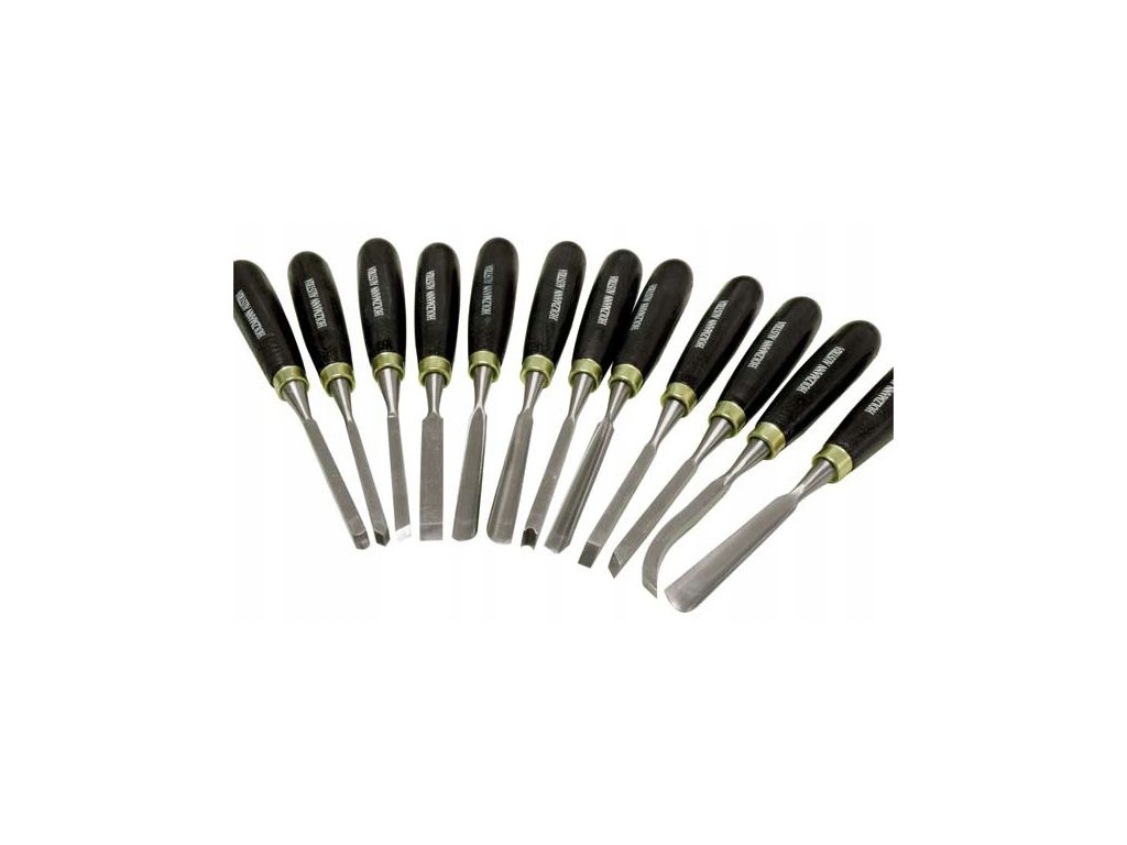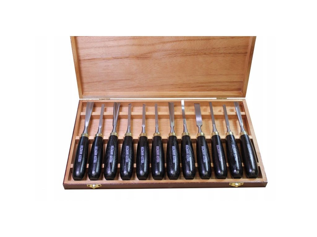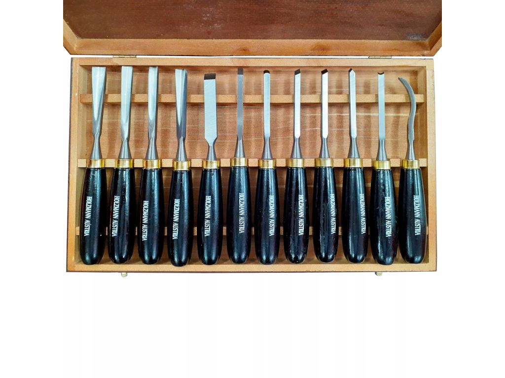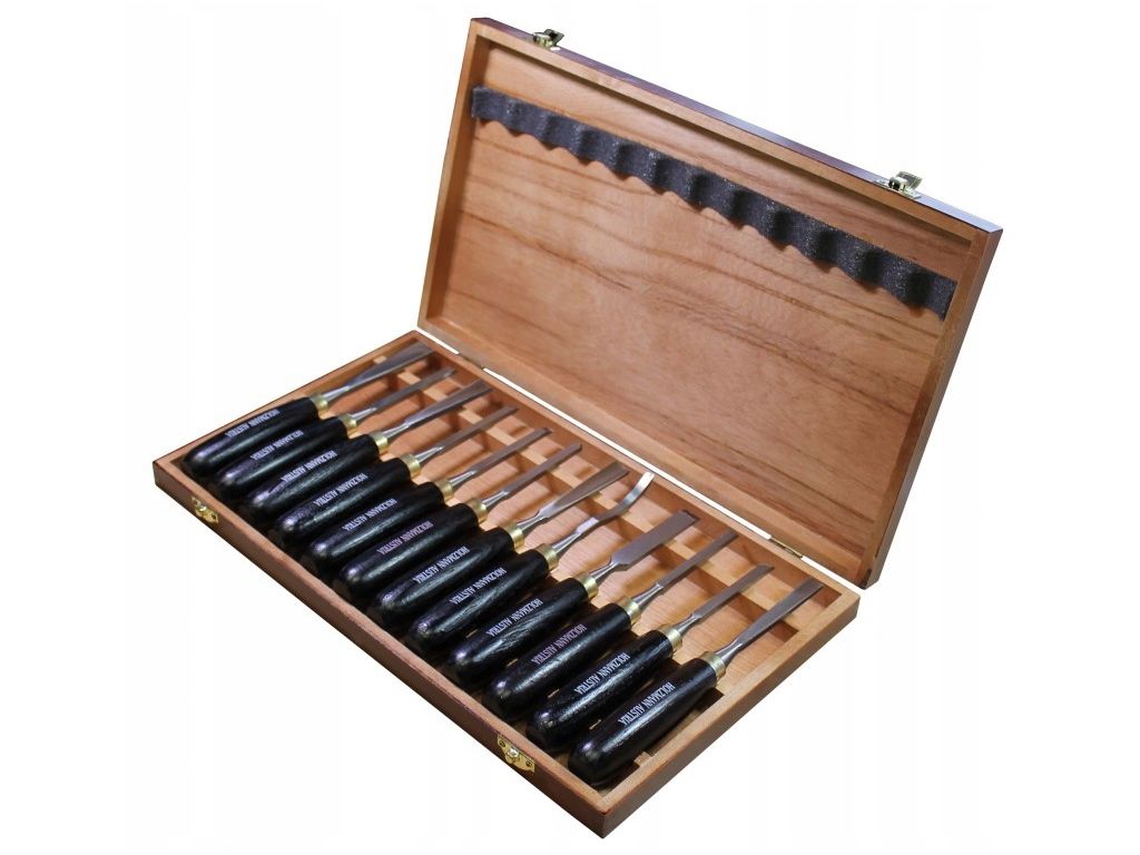 например, плоский резец шириной 12 и 6 мм, пустотелое долото шириной 16, 12 и 10 мм, V-образный резец шириной 16 мм, ширина остальных резцов составляет около 6 мм.;