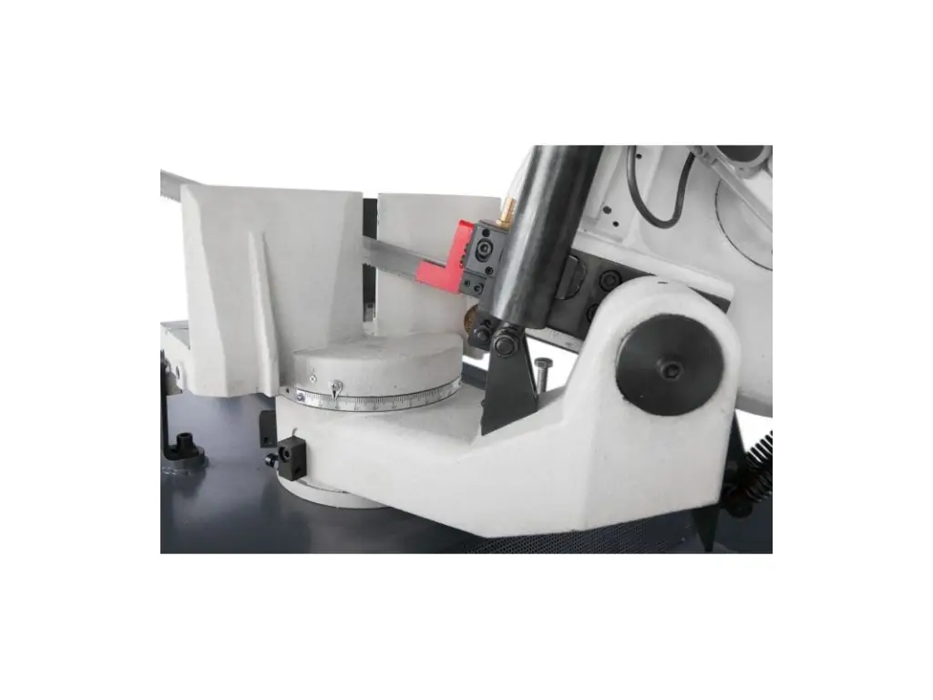Способность резать под углами представляет собой незаменимую функцию станка, данная модель оборудована поворотной головой. В отличие от станка с поворотными давлениями, на станке с поворотной режущей головой заготовку не нужно поворачивать вокруг станка. Это очень актуально для заготовок большой протяженности. Также поворотная голова позволяет добиться лучшей точности угла реза. Поворотную голову гармонично дополняет эксцентриковый зажим давлений, позволяющий после регулировки давлений быстро зафиксировать или отпустить заготовку без повторной регулировки, что увеличивает эффективность работы станка.