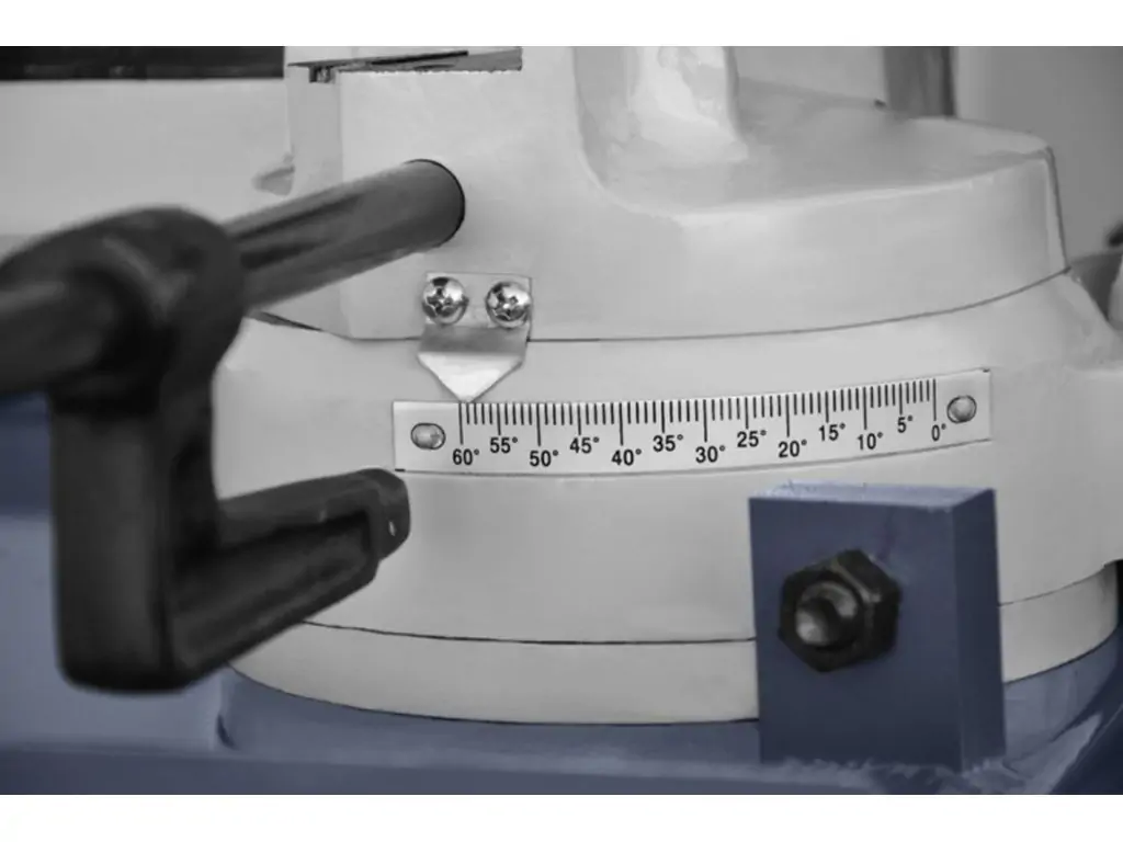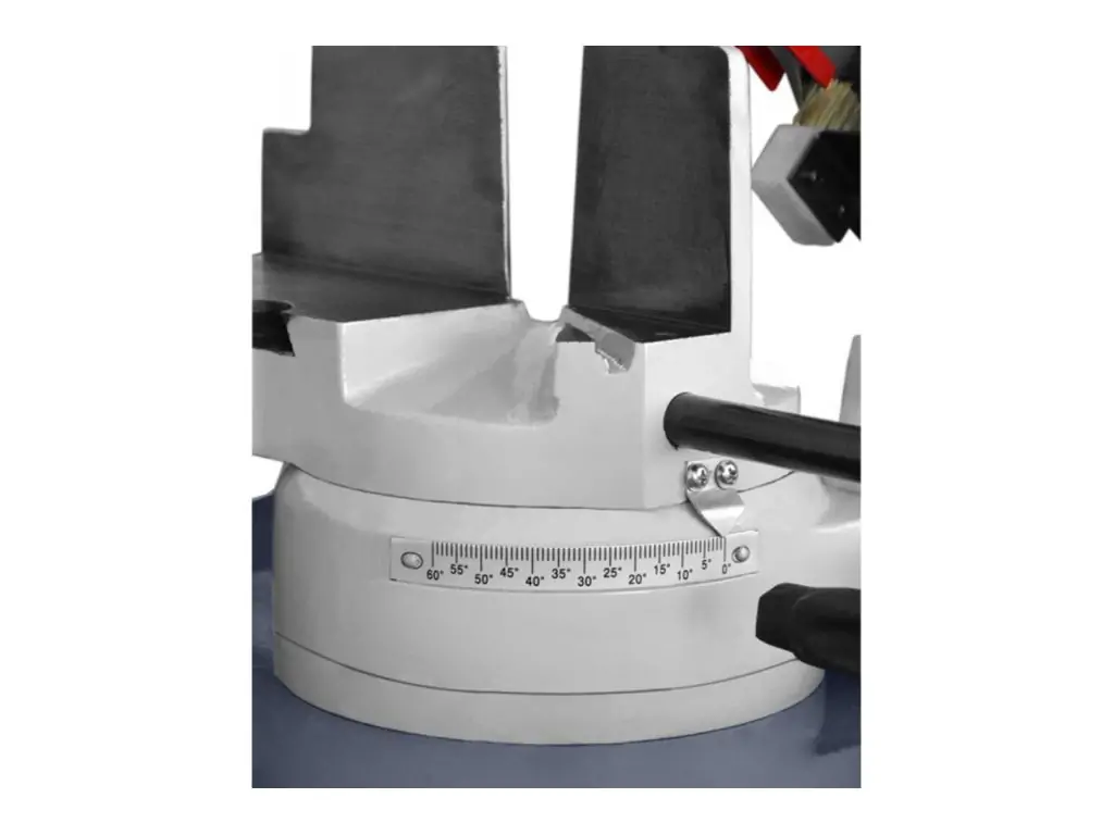 Способность резать под углами представляет собой незаменимую функцию станка, данная модель оборудована поворотной головой. В отличие от станка с поворотными давлениями, на станке с поворотной режущей головой заготовку не нужно поворачивать вокруг станка. Это очень актуально для заготовок большой протяженности. Также поворотная голова позволяет добиться лучшей точности угла реза. Поворотную голову гармонично дополняет эксцентриковый зажим давлений, позволяющий после регулировки давлений быстро зафиксировать или отпустить заготовку без повторной регулировки, что увеличивает эффективность работы станка.