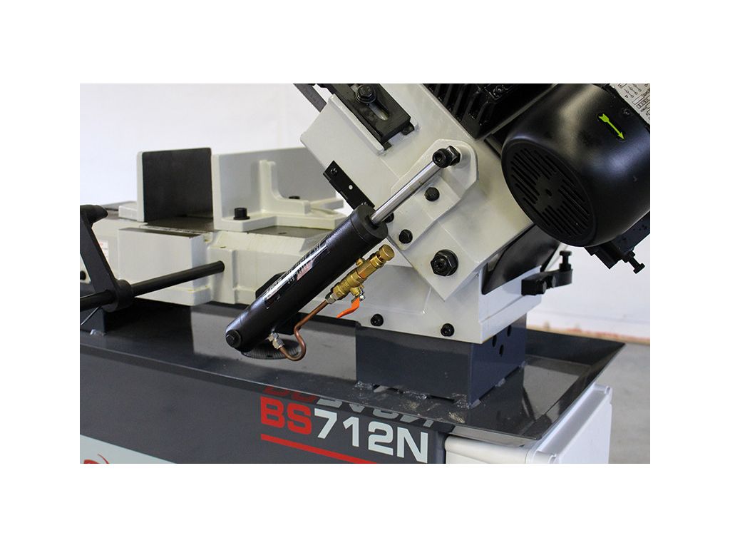 Гидроцилиндр, используемый для опускания головы ленточной пилы, обеспечивает плавное и контролируемое опускание, что позволяет точно контролировать процесс резки. Также гидроцилиндр позволяет зафиксировать режущую голову на любой удобной для конкретной заготовки высоте, чтобы начало опускания головы происходило непосредственно над заготовкой, а не от крайнего верхнего положения.