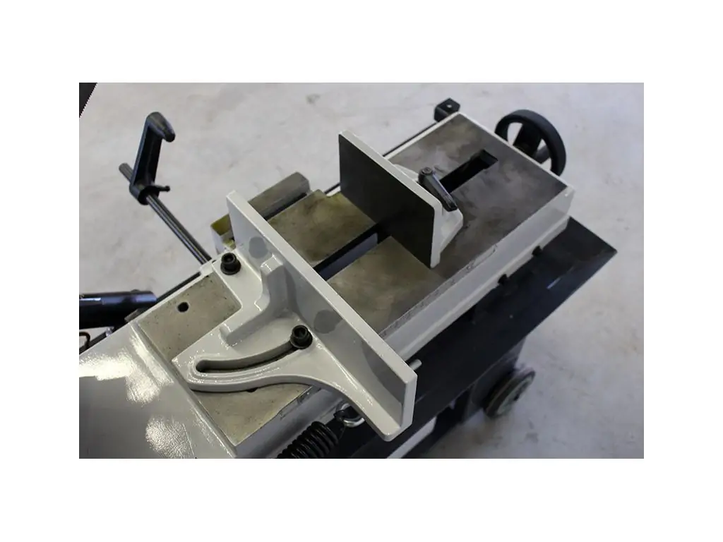 Способность резать под углами представляет собой незаменимую функцию станка, данная модель оборудована поворотными давлениями. Благодаря простоте конструкции имеет более доступную цену по сравнению с пилами с поворотной режущей головой. Используется на производствах, где производится рез как правило под прямым углом и иногда под другими углами.