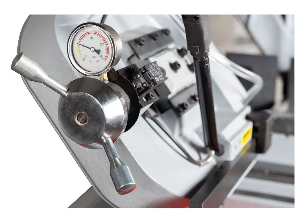 Данный станок оборудован двумя скоростными двигателями (две обмотки), регулировка происходит за счет переключения на пульте управления. Регулировка скорости в ленточных пилах по металлу является важной функцией, так как она оказывает непосредственное влияние на качество и скорость работы с заготовкой. Регулировка скорости позволяет оператору адаптировать скорость резания к конкретному материалу, непосредственно влияющему на эффективность и качество обработки. Подбор соответствующей скорости поможет избежать перегрева полотна или заготовки, что способствует более длительному сроку службы полотна и ожидаемому результату от работы, а также регулировка помогает избежать излишней вибрации.