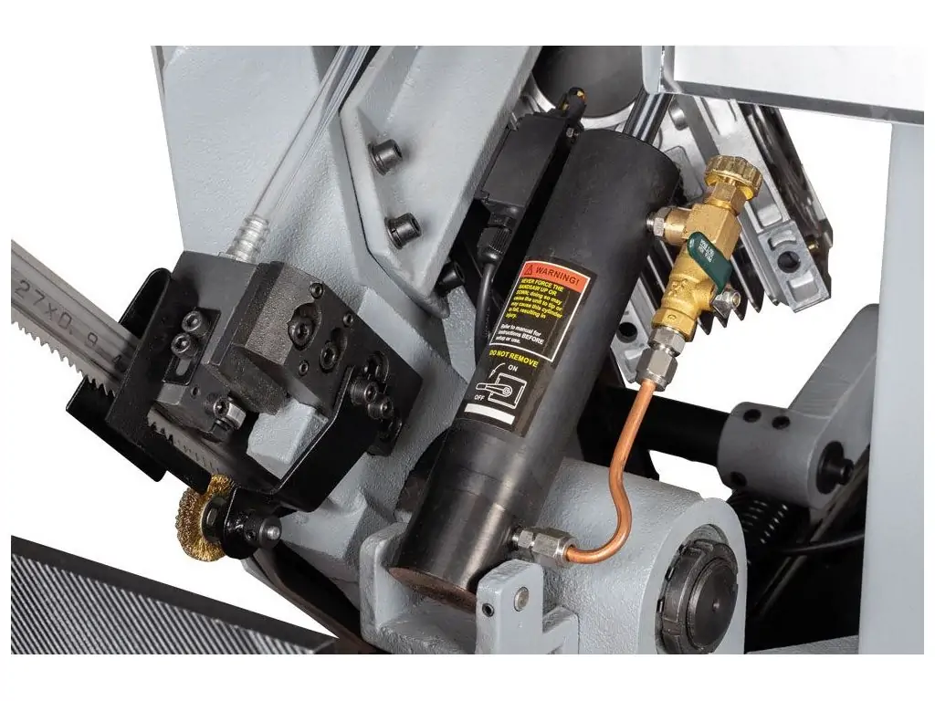Гидроцилиндр, используемый для опускания головы ленточной пилы, обеспечивает плавное и контролируемое опускание головы, что позволяет точно контролировать процесс резки. Также гидроцилиндр позволяет зафиксировать режущую голову на любой удобной для конкретной заготовки высоте, чтобы начало опускания головы происходило непосредственно над заготовкой, а не от крайнего верхнего положения.
