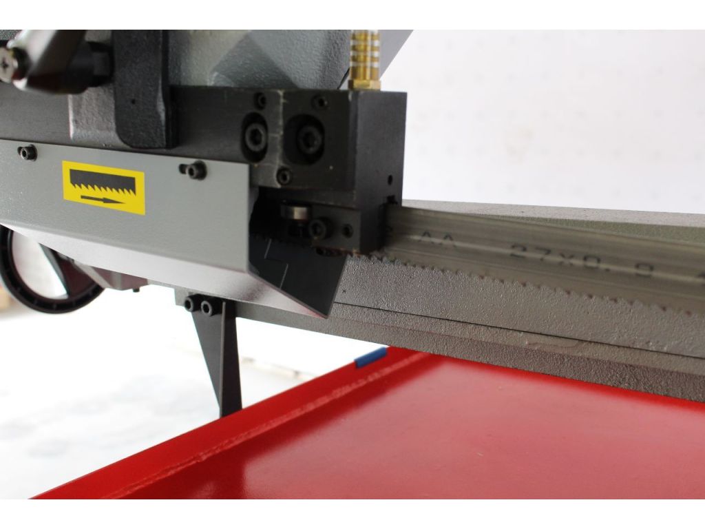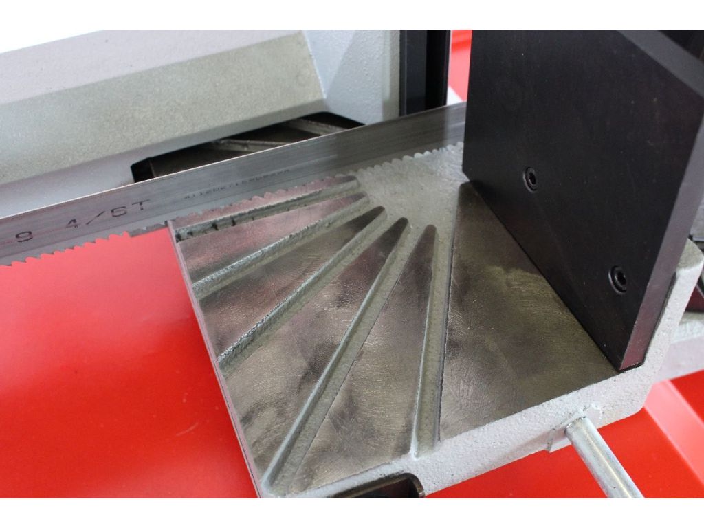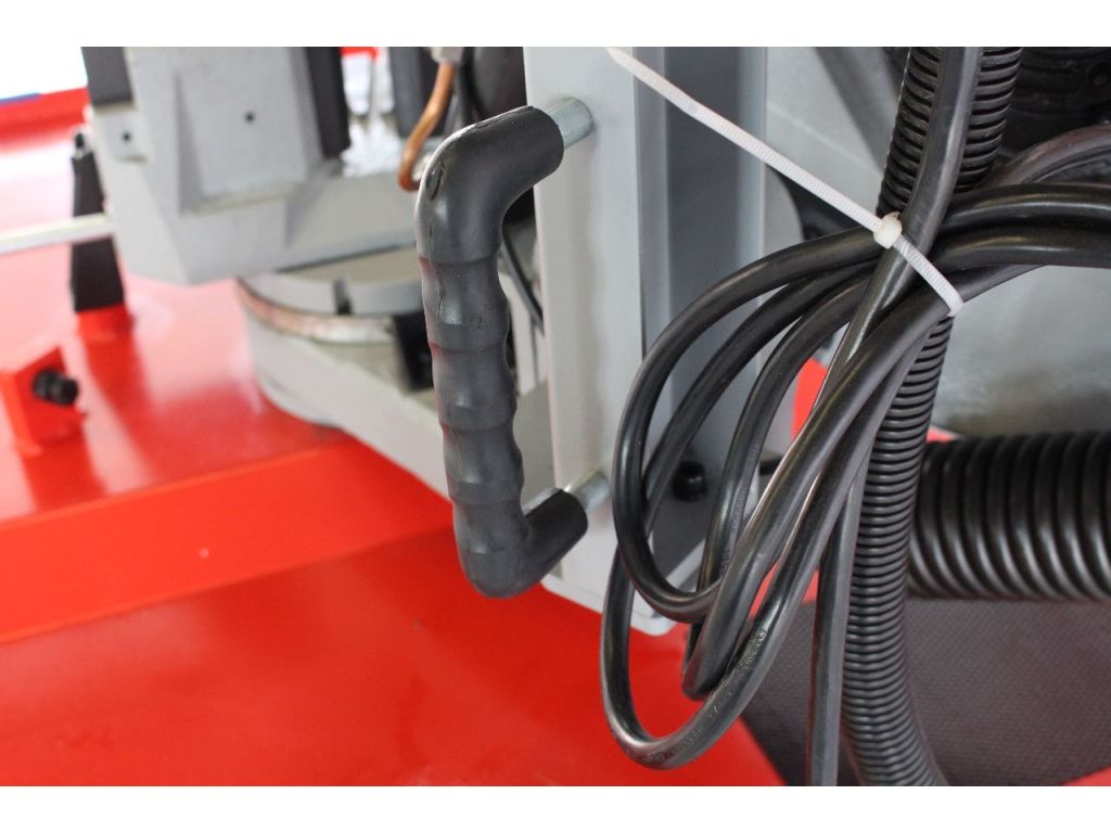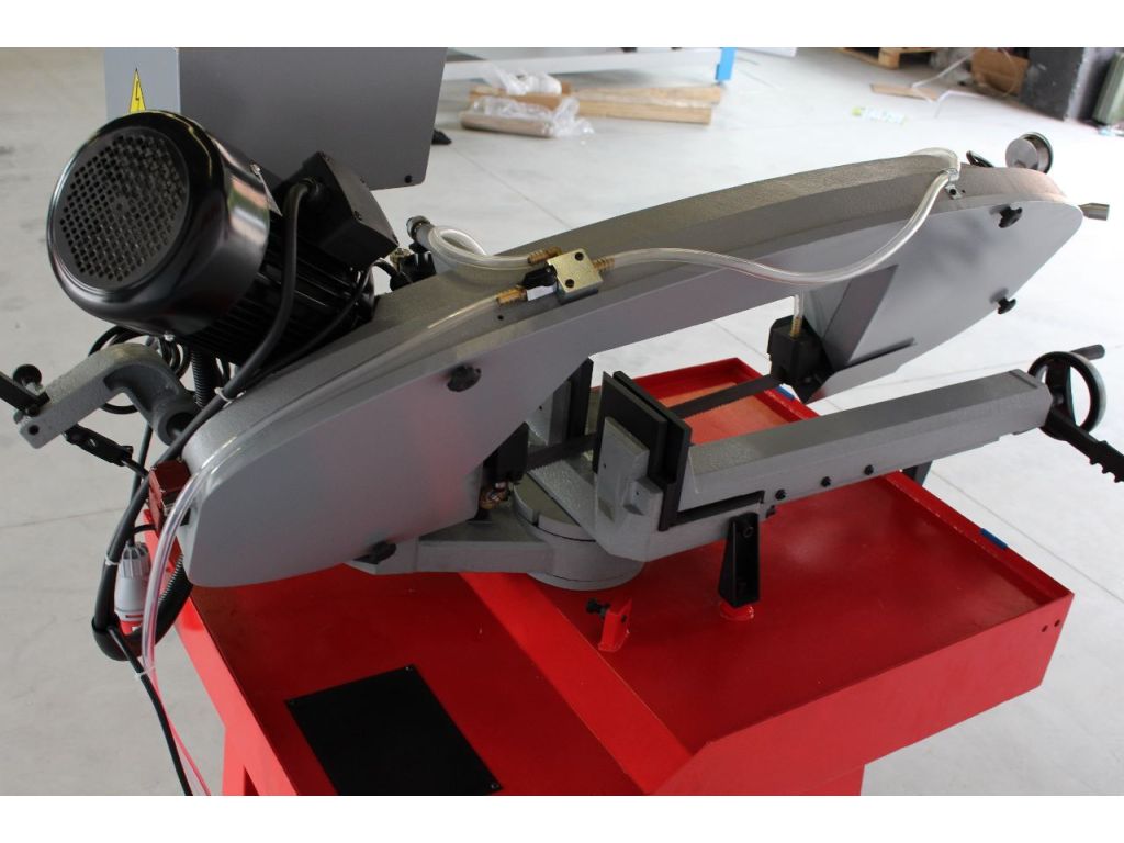 Опускание пильного узла осуществляется автоматически или вручную. Скорость опускания плавно регулируется гидравлическим цилиндром. Для надежной фиксации заготовки используются быстрозажимные регулируемые тиски. Система охлаждения СОЖ предотвращает перегрев и улучшает качество резки. Станина дополнена отсеком для хранения инструмента. Благодаря промышленному дизайну и качественным материалам изготовления, эта ленточная пила для резки металла очень эффективная и долговечная.