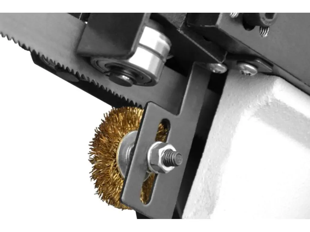 Ленточная пила оборудована проволочной щеткой, которая очищает полотно, позволяет избежать накопления стружки и других отходов на шкивах. Стружка на шкивах крайне негативно влияет на точность вертикального реза, наличия лишних шумов и неравномерного натяжения полотна. Чистое полотно обеспечивает лучший контакт с материалом, также очищенное полотно требует меньше энергии для резки, что может снизить нагрузку на двигатель и другие механизмы пилы.