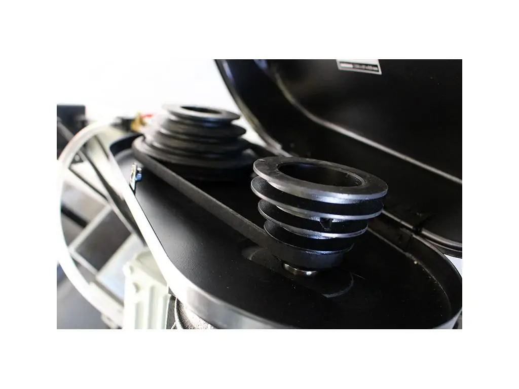 Данный станок оборудован ременной передачей, регулировка скорости происходит за счет опрокидывания ремня на соответствующий шкив. Регулировка скорости в ленточных пилах по металлу является важной функцией, так как она оказывает непосредственное влияние на качество и скорость работы с заготовкой. Регулировка скорости позволяет оператору адаптировать скорость резания к конкретному материалу, непосредственно влияющему на эффективность и качество обработки. Подбор соответствующей скорости поможет избежать перегрева полотна или заготовки, что способствует более длительному сроку службы полотна и ожидаемому результату от работы, а также регулировка помогает избежать излишней вибрации.