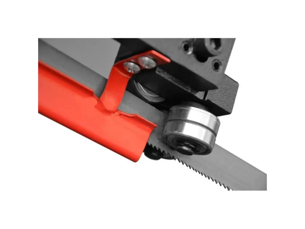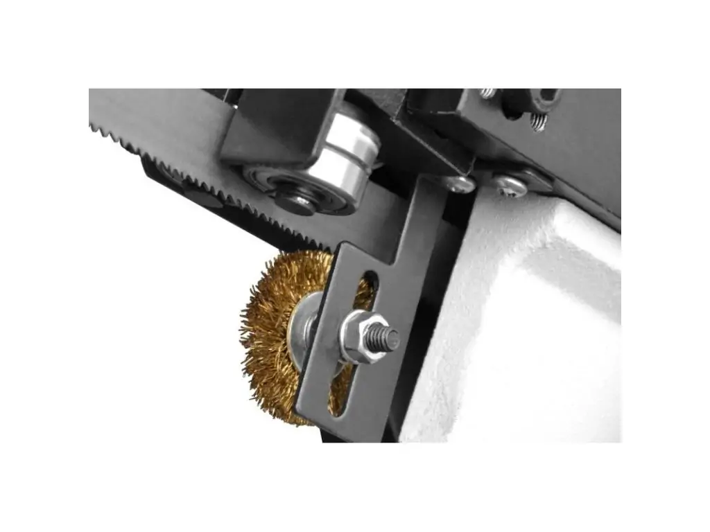 Ленточная пила оборудована проволочной щеткой, которая очищает полотно, позволяет избежать накопления стружки и других отходов на шкивах. Стружка на шкивах крайне негативно влияет на точность вертикального реза, наличия лишних шумов и неравномерного натяжения полотна. Чистое полотно обеспечивает лучший контакт с материалом, также очищенное полотно требует меньше энергии для резки, что может снизить нагрузку на двигатель и другие механизмы пилы.