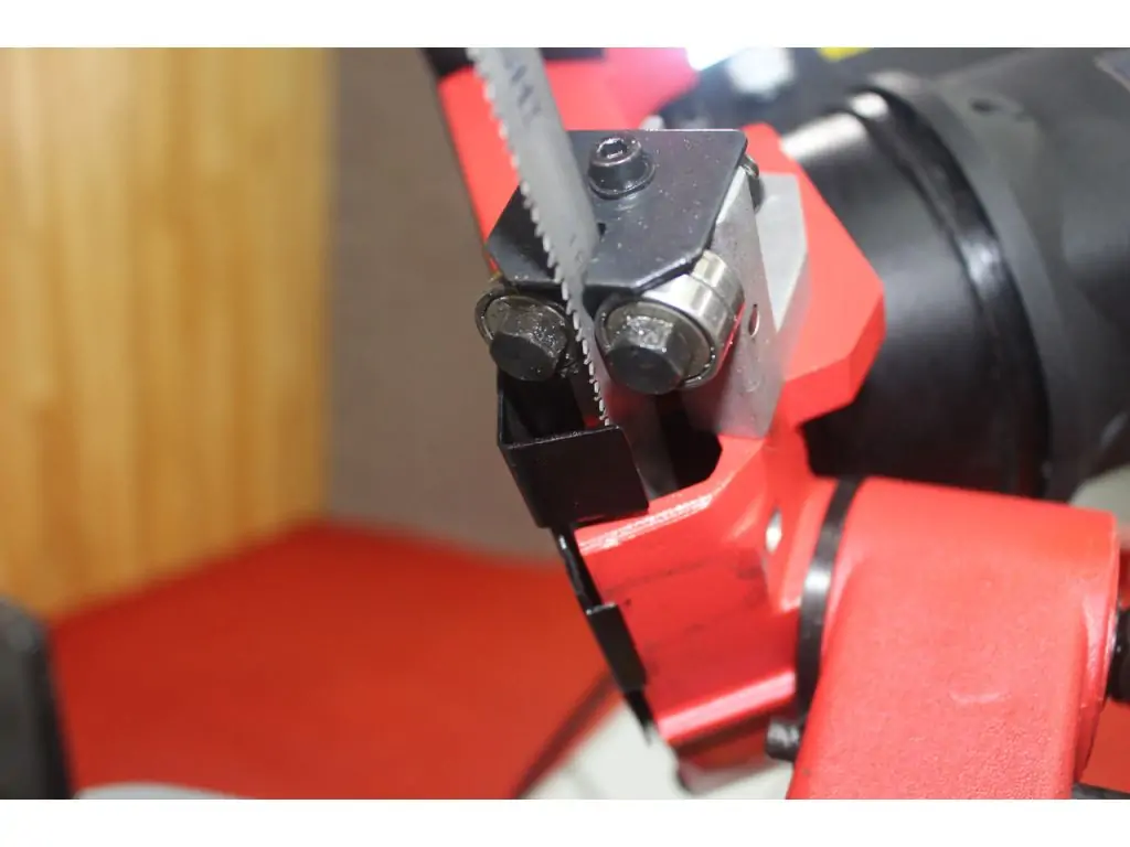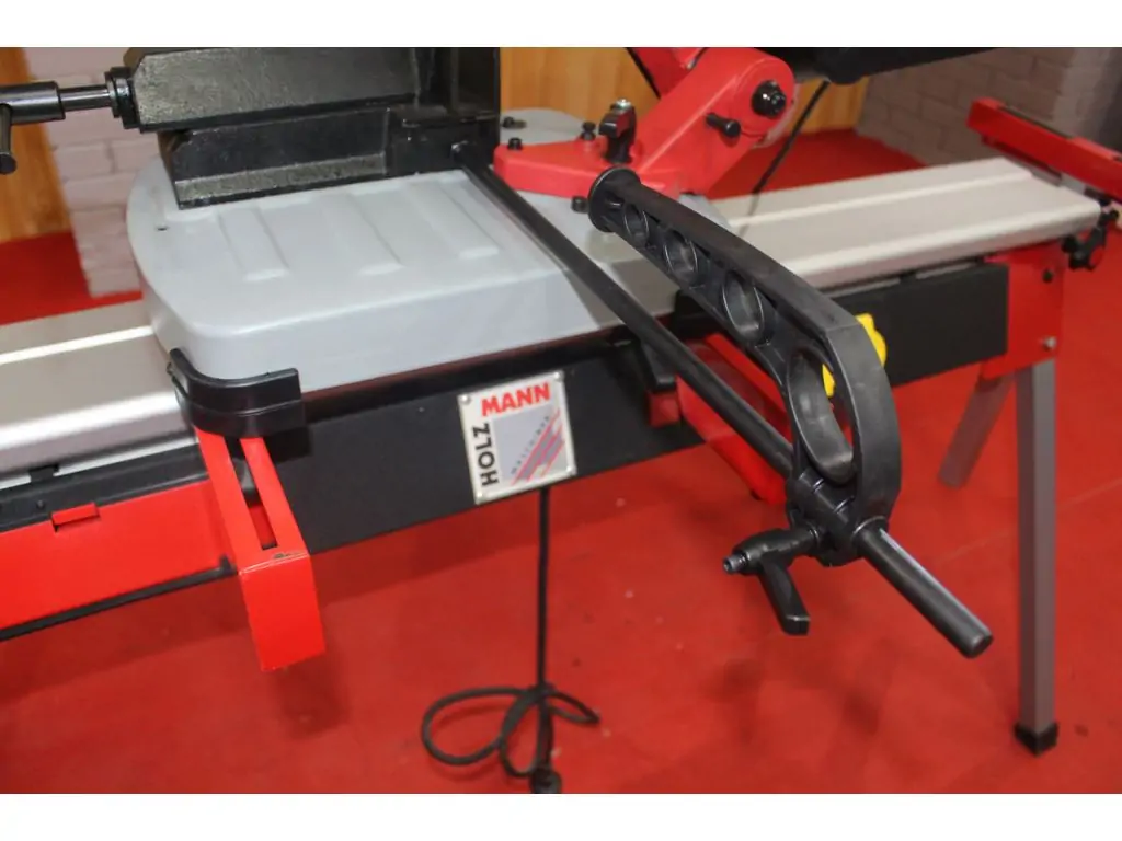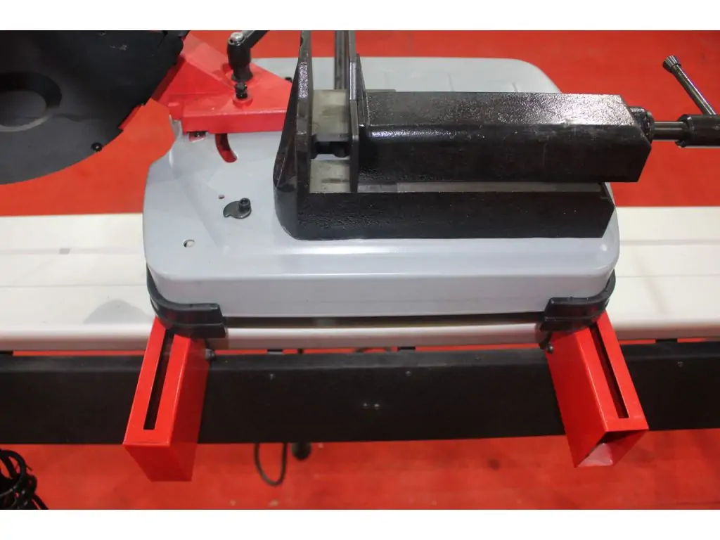 Способность резать под углами представляет собой незаменимую функцию станка, данная модель оборудована поворотной головой. В отличие от станка с поворотными давлениями, на станке с поворотной режущей головой заготовку не нужно поворачивать вокруг станка. Это очень актуально для заготовок большой протяженности. Также поворотная голова позволяет добиться лучшей точности угла реза. Поворотную голову гармонично дополняет эксцентриковый зажим давлений, позволяющий после регулировки давлений быстро зафиксировать или отпустить заготовку без повторной регулировки, что увеличивает эффективность работы станка.