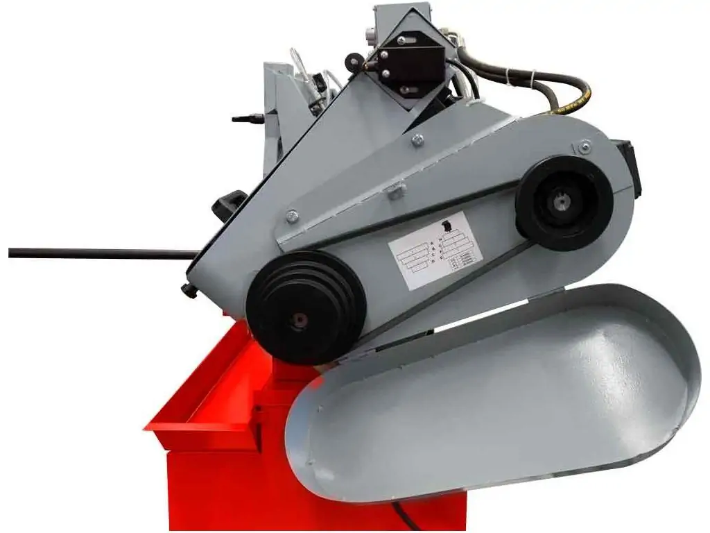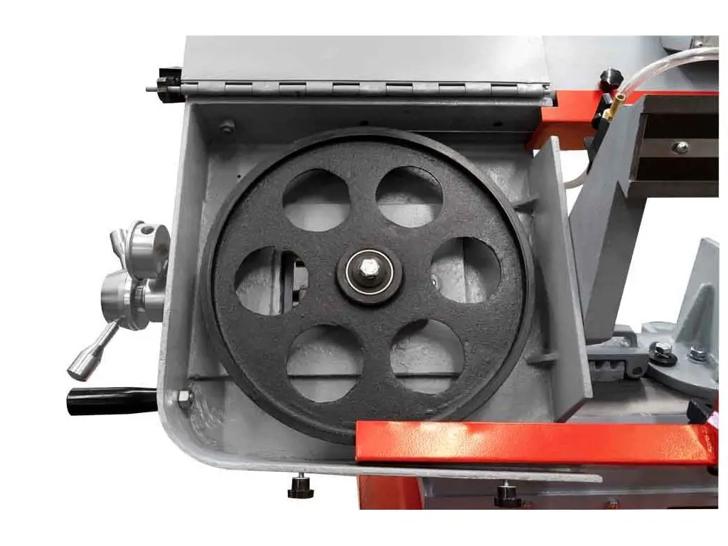 Данный станок оборудован ременной передачей, регулировка скорости происходит за счет опрокидывания ремня на соответствующий шкив. Регулировка скорости в ленточных пилах по металлу является важной функцией, так как она оказывает непосредственное влияние на качество и скорость работы с заготовкой. Регулировка скорости позволяет оператору адаптировать скорость резания к конкретному материалу, непосредственно влияющему на эффективность и качество обработки. Подбор соответствующей скорости поможет избежать перегрева лент или заготовки, что способствует более длительному сроку службы лент и ожидаемому результату от работы, а также регулировка помогает избежать излишней вибрации.