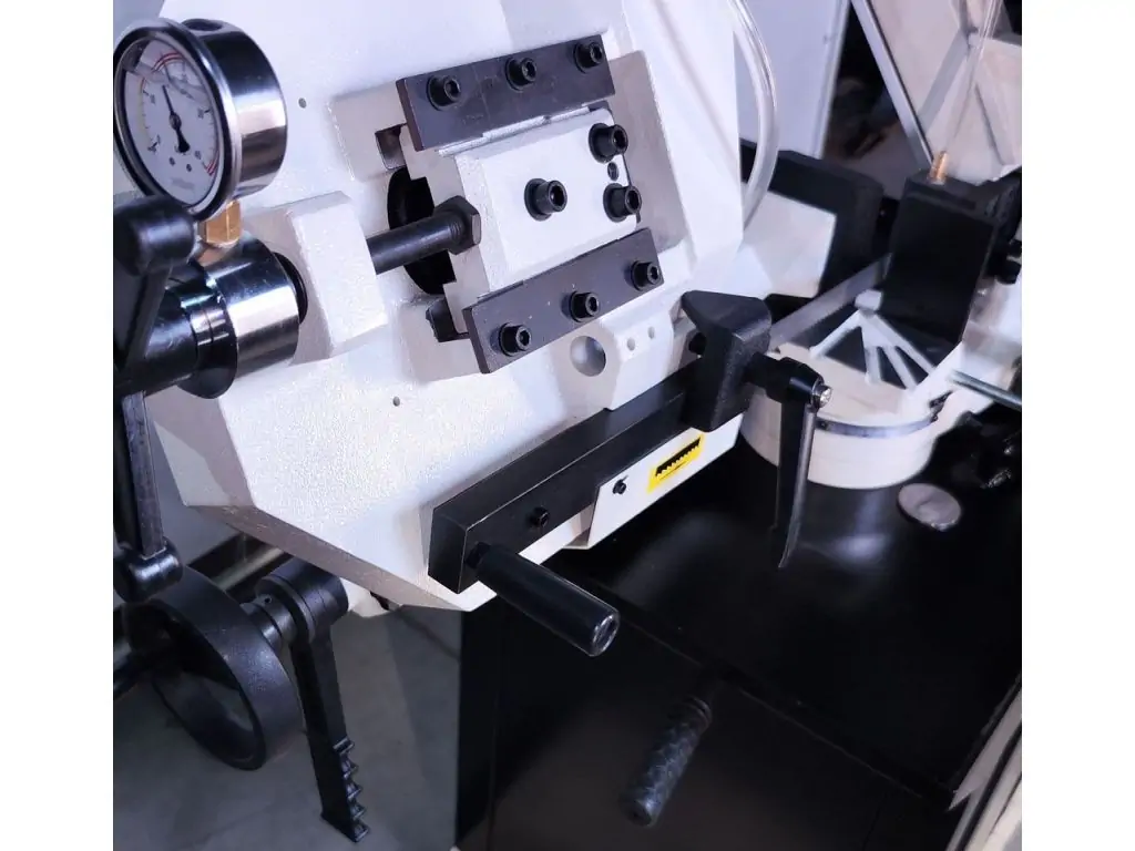 Лента имеет 2 скорости движения – 37,5 и 75 м/мин, благодаря чему можно адаптировать параметры резки под конкретный материал. Скорость опускания режущей головы плавно регулируется с помощью гидроцилиндра. Тиски с эксцентриковым зажимом позволяют быстро зафиксировать и отпустить заготовку. Есть манометр для контроля натяжения полотна. Конструкция пилы выполнена из чугуна, тяжелая, жесткая и очень прочная. Чтобы купить пилу для резки металла MAST Metalltechnik M-BS275 400V, оставляйте заказ на сайте.