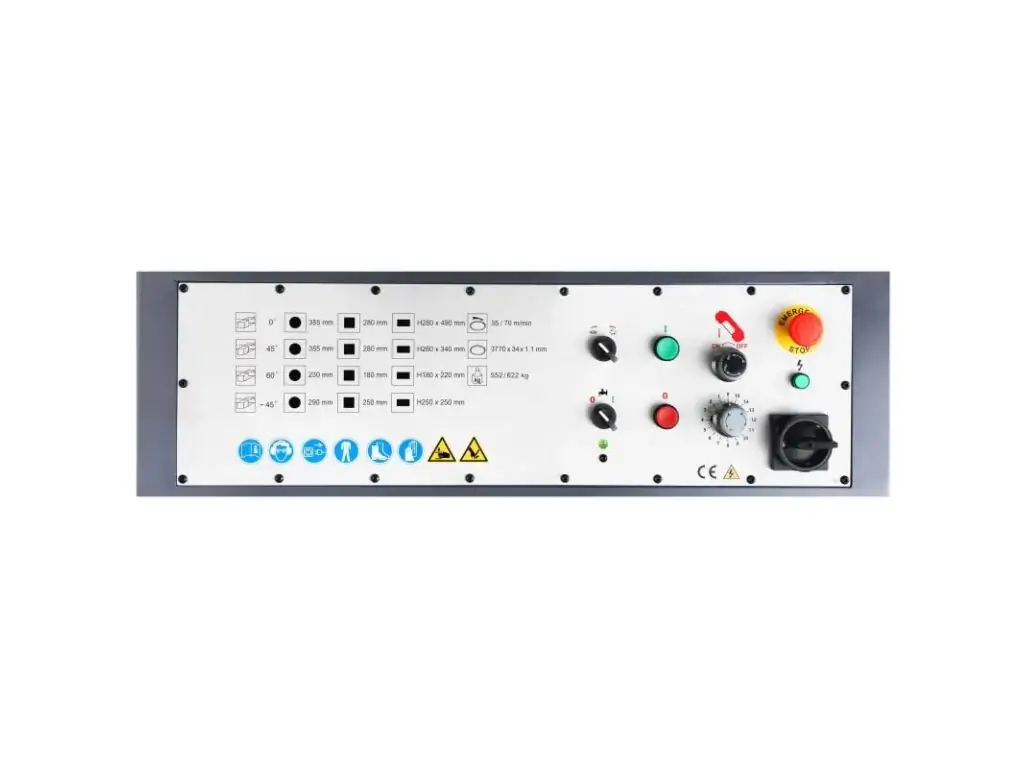 Эргономичная панель управления содержит четко расположенные кнопки для основных функций: запуска, остановки, регулировки скорости ленты (35/70 м/мин), активации системы охлаждения. Также предусмотрен аварийный выключатель, соответствующий современным стандартам безопасности ЕС.