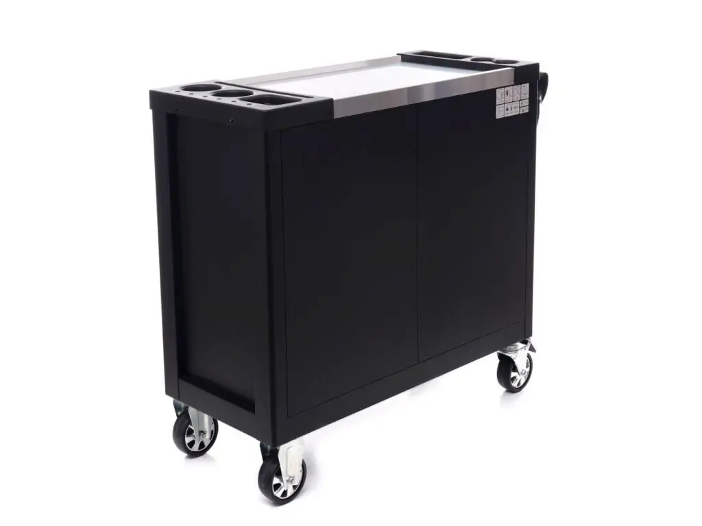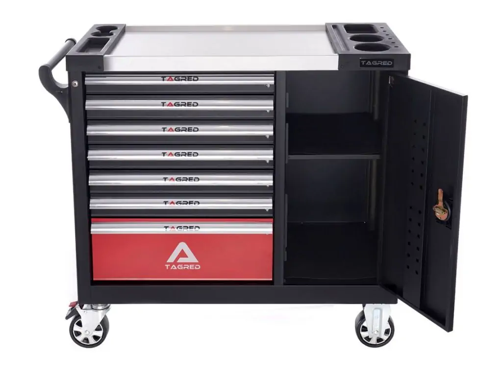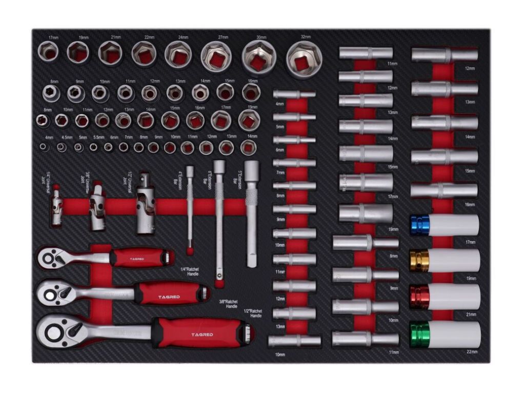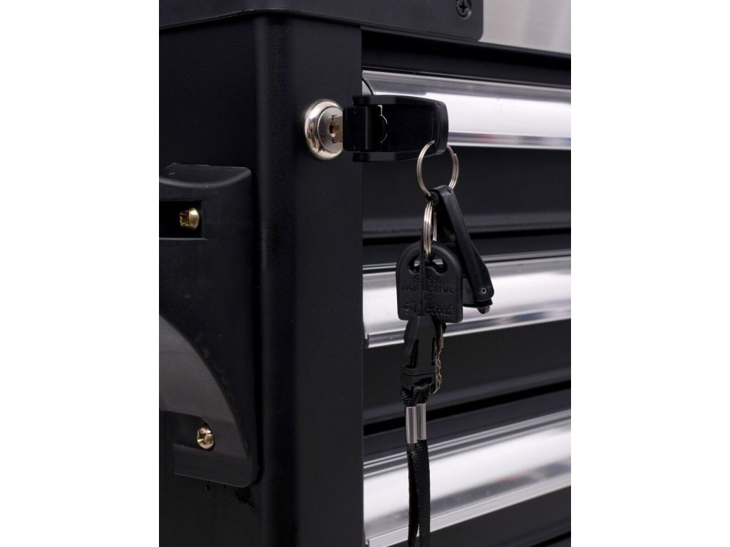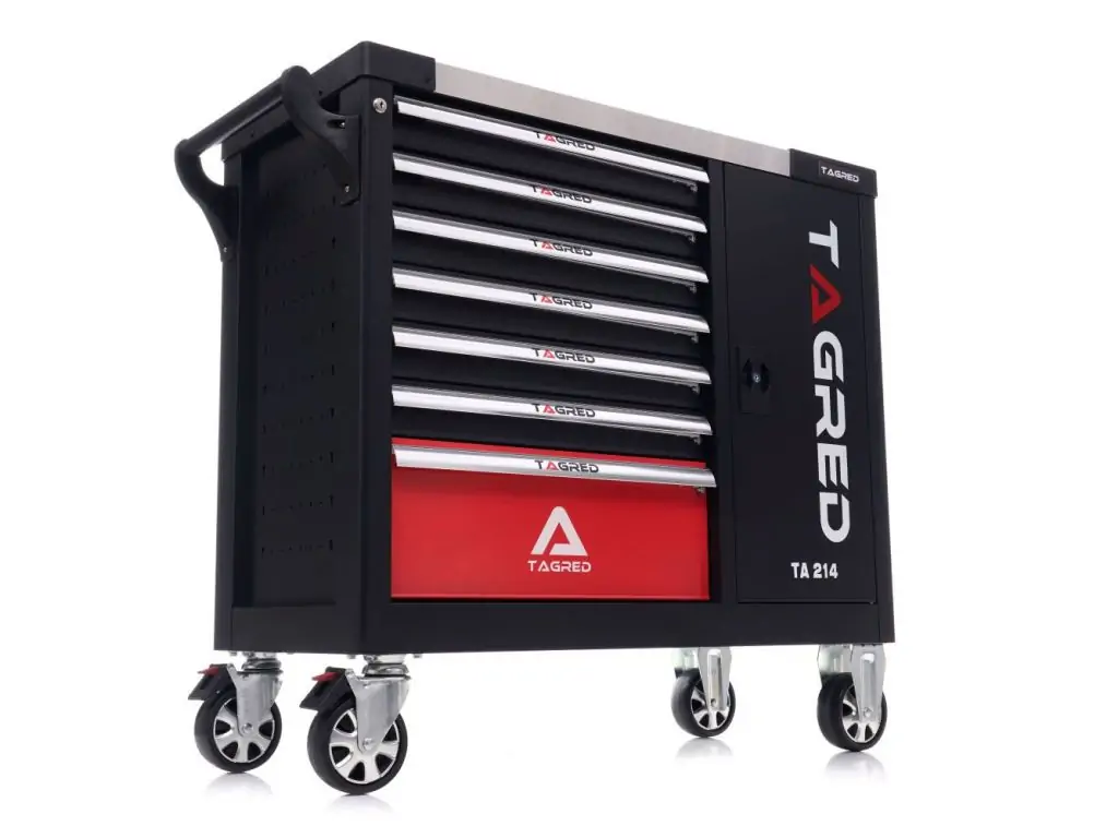 Тележка для мастерской с инструментами TAGRED TA214, 298 эл. - позволяет поддерживать порядок на рабочем месте и защищает инструменты от кражи (тележка закрывается на ключ). Тележка имеет эргономичные ручки, интегрированные с верхом и полностью выдвижные ящики на подшипниках. Центральный замок с двумя ключами, закрывающими все ящики, а также двойные стенки и замок для ящиков. Тележка оснащена 4 колесами, включая 2 поворотных колеса, что делает ее очень удобной для транспортировки. Столешница универсальная перфорированная (из полипропилена). Трещотки изготовлены из хромованадиевой стали CrV6140.