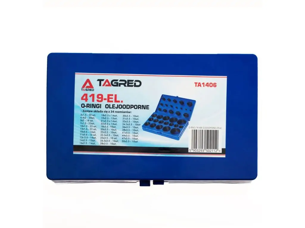 Резиновые уплотнители TAGRED TA1406 - комплект высокопрочных уплотнительных колец, устойчивых к моторным маслам, мазутам, маслам, гидравлическим жидкостям, алифатическим углеводородам, таким как пропан, бутан, бензин, спирты, эмульсии масло/вода типа HSA, полиг. растворы солей типа HSC, разбавленные кислоты и основания при низких температурах; вода до 60°C.