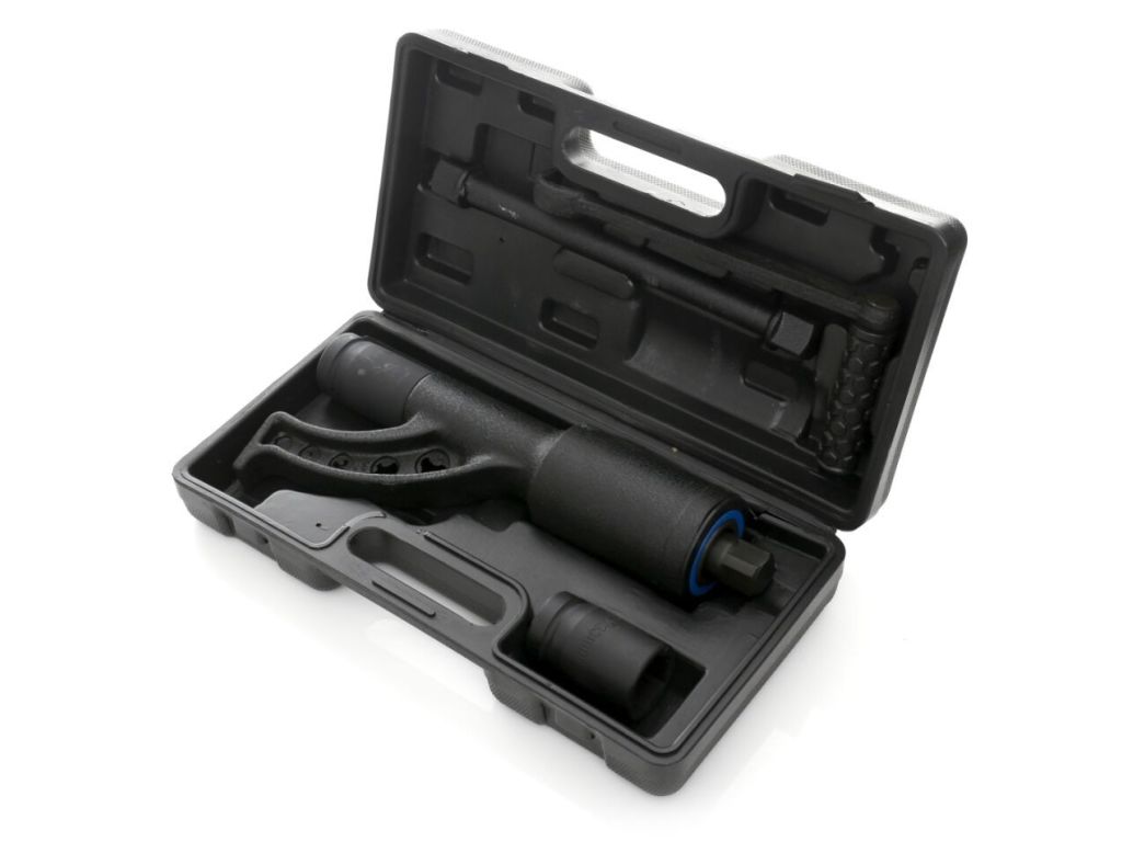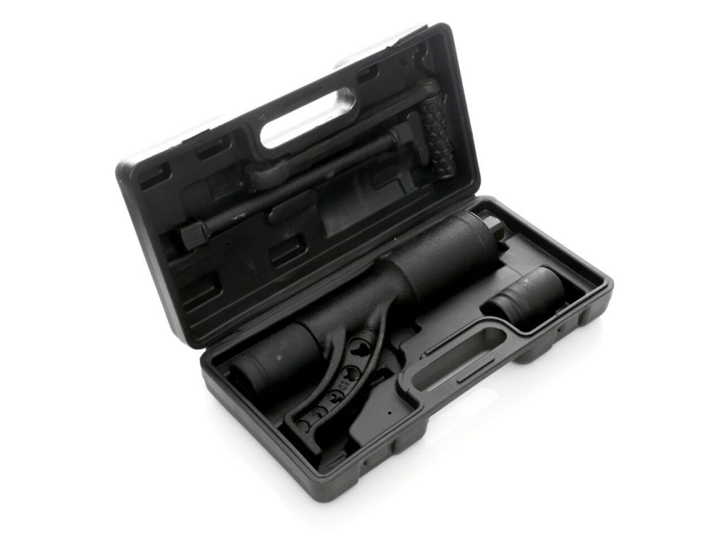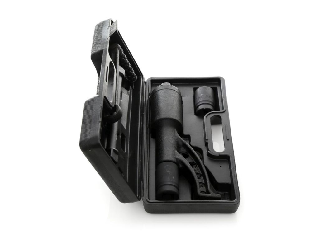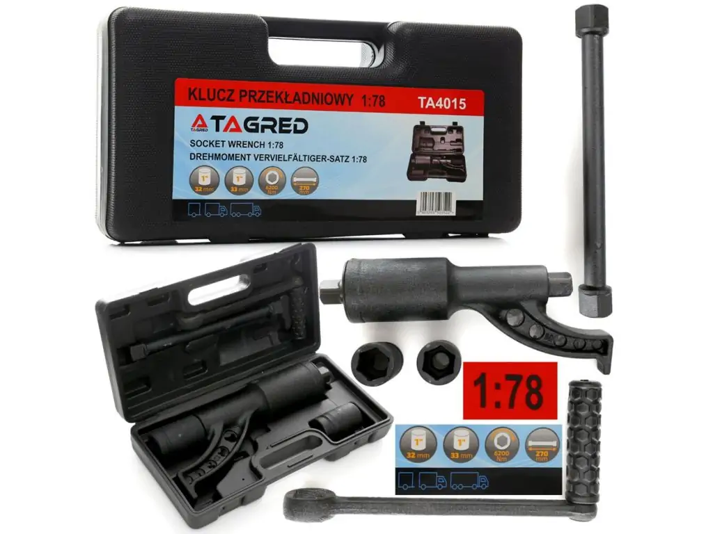 В комплект поставки входят головки 32 мм и 33 мм, а также удлинитель 270 мм, что позволяет сразу использовать инструмент без необходимости докупать аксессуары. Ключ не требует подключения к компрессору или электричеству, что дает возможность эффективно работать в полевых условиях. Этот ручной планетарный ключ для грузовиков поставляется в прочном кейсе, что обеспечивает удобство транспортировки и хранения.