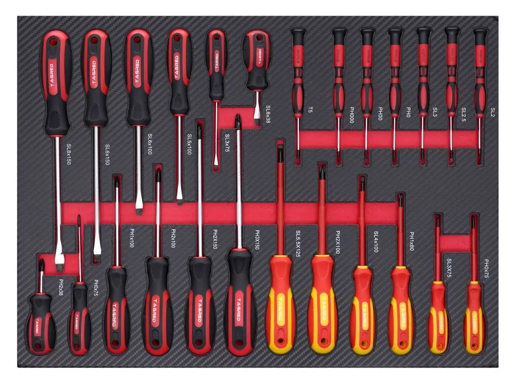 - Отвертка (12 шт): SL6*38 мм; 3*75 мм; 5*100 мм; 6*100 мм; 6*150мм; 8*150мм | PH2*38 мм; PH0*75мм; PH1*80мм; PH2*100мм; PH2*150мм; PH3*150мм