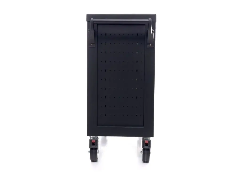 Тележка имеет прочную конструкцию из авиационного алюминия, нержавеющей стали и ударопрочного пластика, края и углы дополнены амортизирующими резиновыми накладками. Большие колеса, 2 из которых поворотные, обеспечивают удобное перемещение тележки, а автоматическая блокировка и тормоз предотвращают самопроизвольное движение, и тележка с инструментами надежно фиксируется в нужном месте.