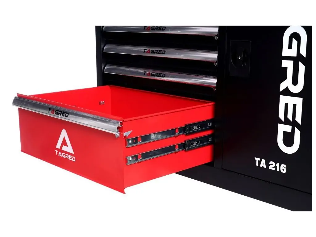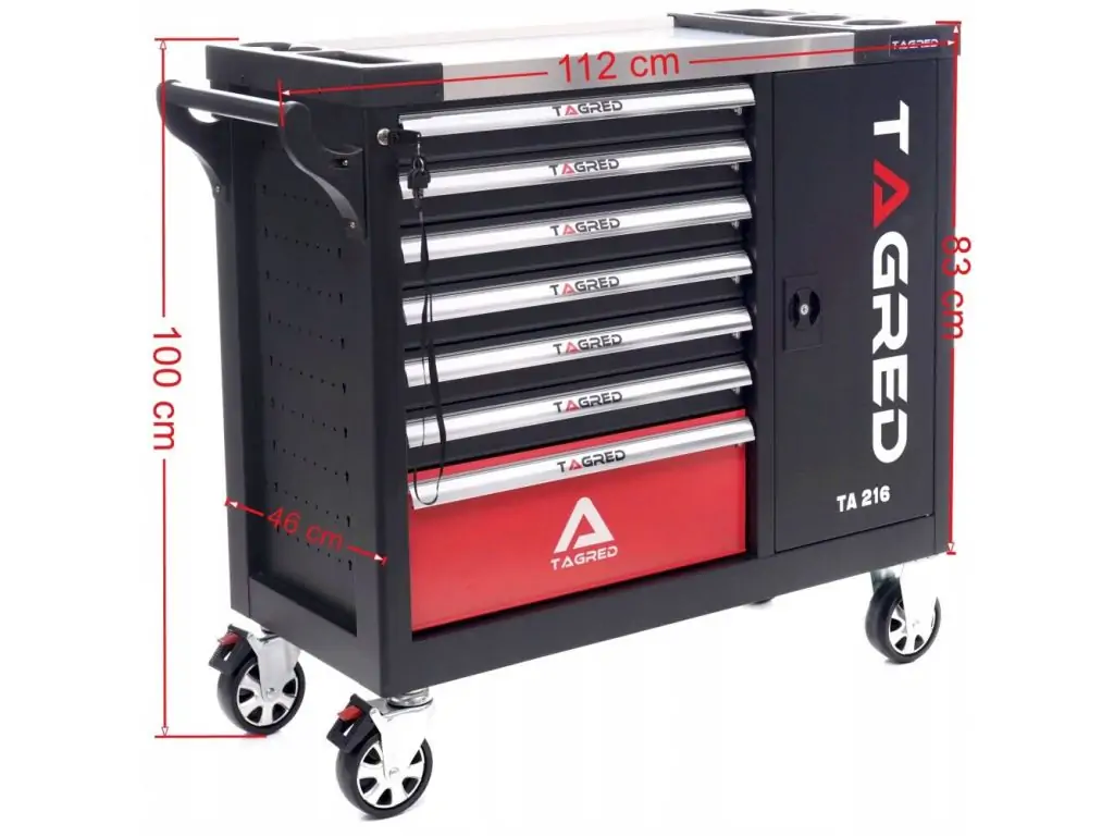 Тележка для мастерской с инструментами TAGRED TA216 – это отличное приобретение для автомастерских, которое сочетает высокое качество, надежность и удобство. Содержит 306 профессиональных инструментов из хромванадиевой стали, обладающих высокой устойчивостью к деформациям и износу. Инструменты компактно размещены в 7 выдвижных ящиках с усиленными направляющими и шариковым механизмом скольжения. Нижний ящик оснащен двойной направляющей системой и выдерживает нагрузку до 50 кг. Центральная система замыкания с двумя ключами блокирует все ящики, каждый ящик дополнительно оснащен индивидуальным замком. Верхняя панель с универсальной перфорацией позволяет удобно закрепить дополнительные аксессуары.