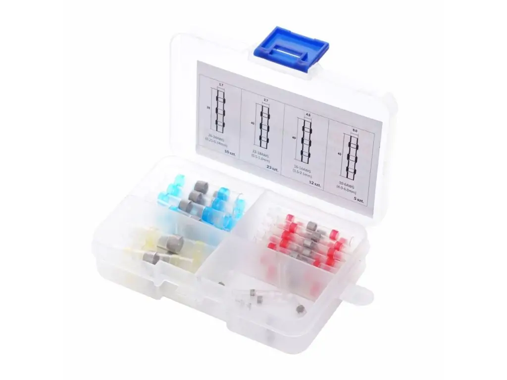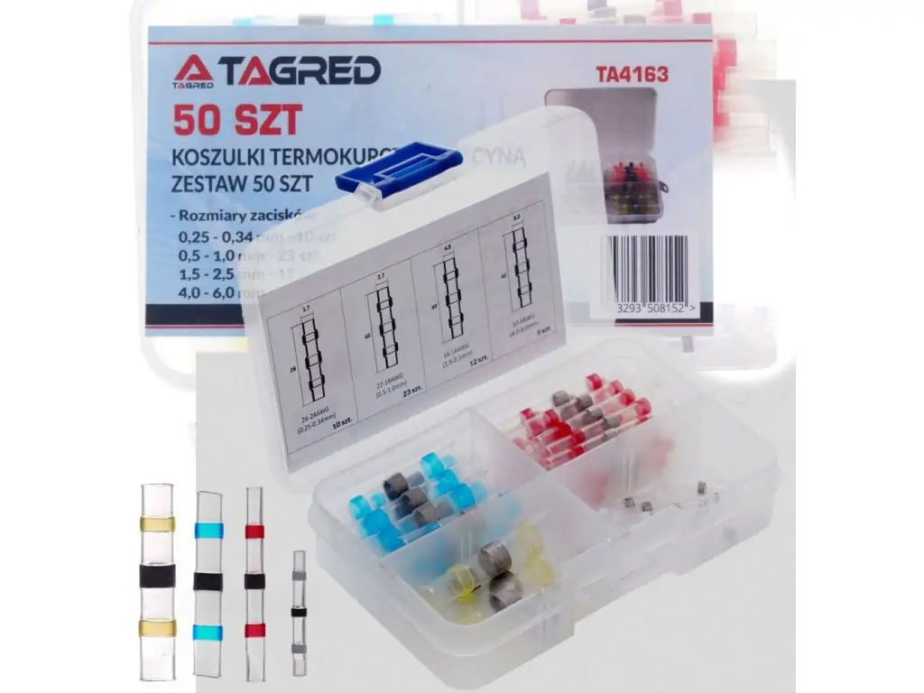 Термоусадочные гильзы TAGRED TA4163 - характеризуются отличной стойкостью к растяжению и механическим повреждениям, с полиэтиленовыми трубками со стенками снаружи и оловом внутри, что обеспечивает превосходную водостойкость. Внутри каждого быстросоединителя есть слой клея, который укрепляет и защищает соединение от влаги. После подключения проводов дополнительная изоляция не требуется. Быстрые разъемы можно использовать в автомобилях, лодках, мотоциклах и бытовых приложениях.