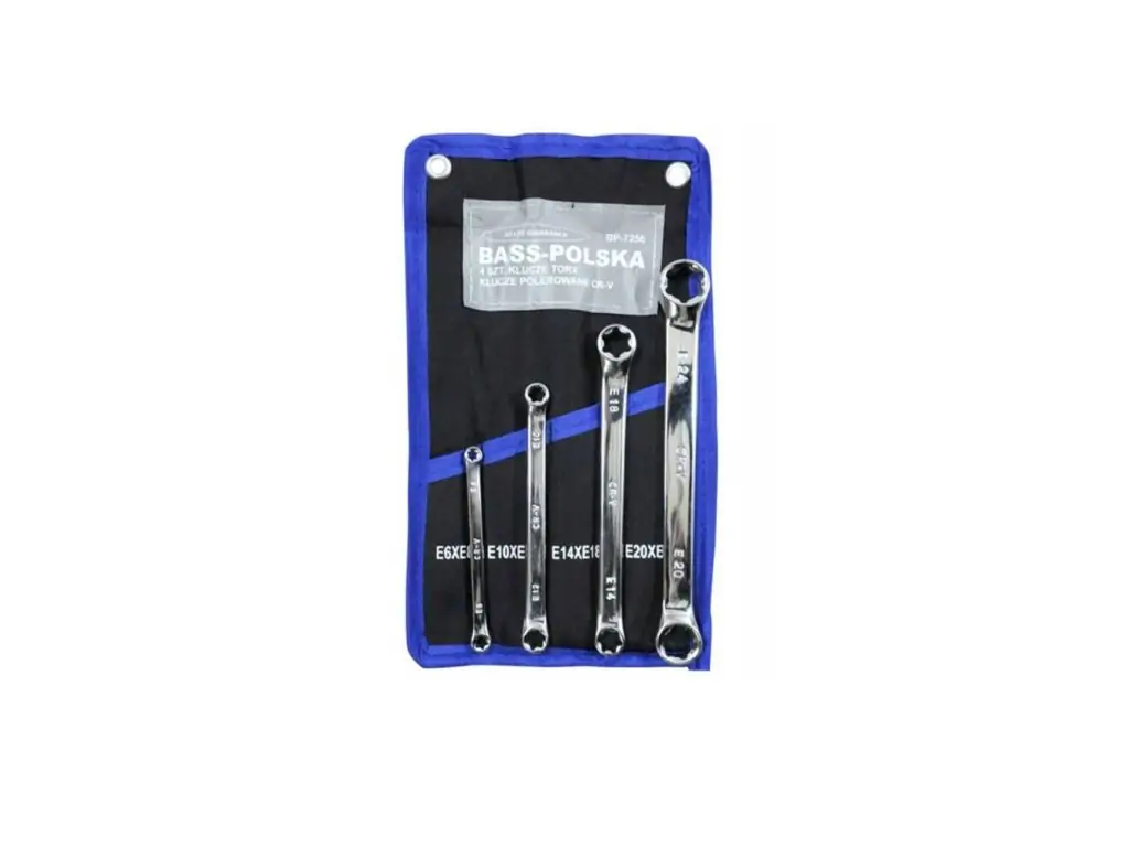 Набор накидных ключей Bass Polska BP-7256 - состоит из четырех ключей, изготовленных из хромованадиевой стали, что обеспечивает длительный срок службы и надежность. Сатинированное покрытие ключей помогает предотвратить соскальзывание. Эти прочные ключи Torx обеспечивают лучшую передачу момента, чем шестигранные ключи. Весь набор удобно размещен в футляре с номерами ключей и отверстиями для подвешивания на стену. Технические характеристики включают следующие размеры ключей Torx: E6 x E8, E10 x E12, E14 x E18, E20 x E24, при длине от 115 мм до 120 мм, изготовленные из стали CrV.