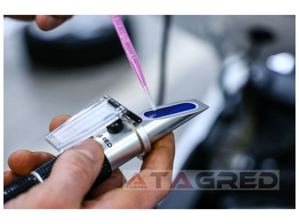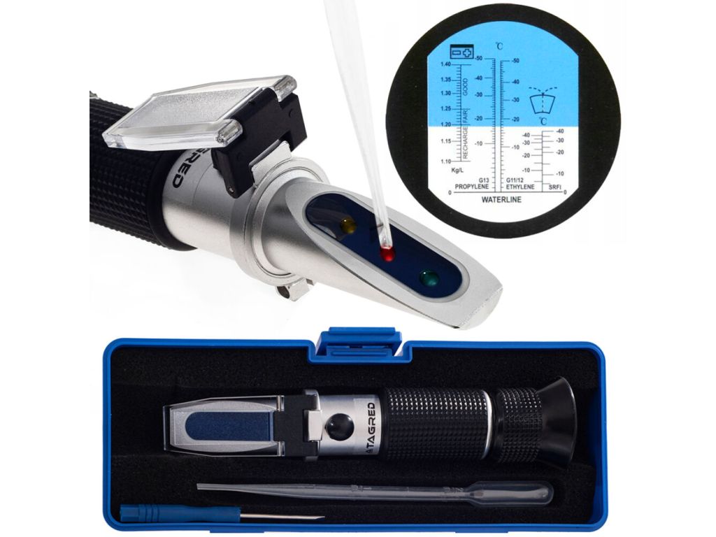 - Профессиональный рефрактометр для измерения рабочих жидкостей в легковых автомобилях, грузовиках и автобусах. Предназначен для определения температуры замерзания стеклоомывателя, пропиленгликолевой охлаждающей жидкости и этиленгликоля, а также диапазона плотности электролита.