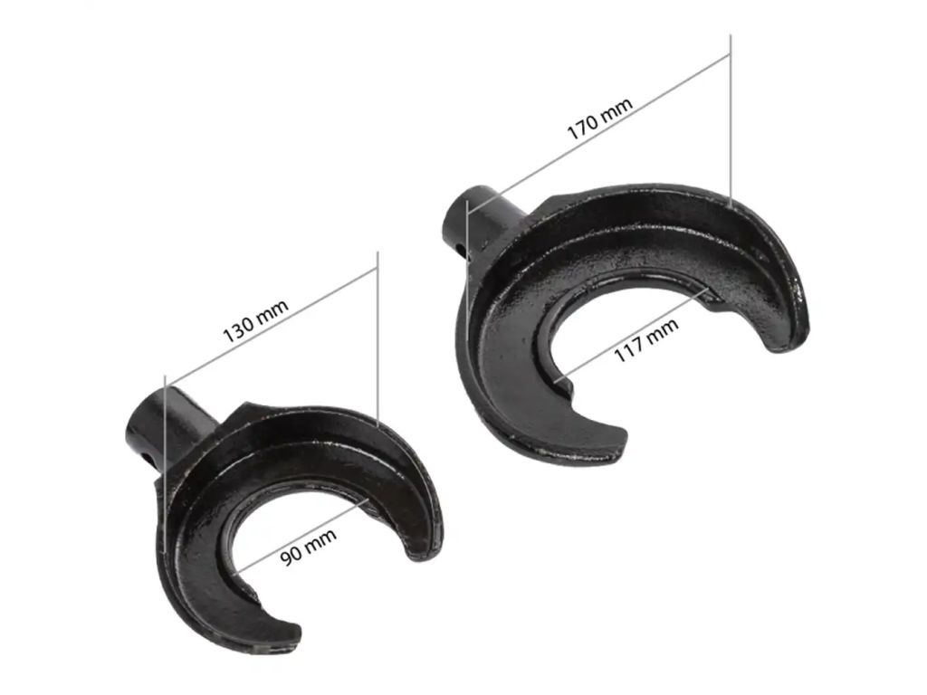 Гидравлический привод обеспечивает плавное и регулируемое сжатие и демонтаж пружины. Управление процессом осуществляется с помощью 2 ножных педалей, одна из которых отвечает за подъем поршня привода, а другая – за опускание. Для регулировки плеча с головой в стойке есть 8 отверстий. Мелкая резьба нити обеспечивает максимально точную регулировку и устойчивость к нагрузкам. Стойкая к скручиванию конструкция из прочного чугуна делает этот съемник пружин гидравлический чрезвычайно надежным и долговечным.