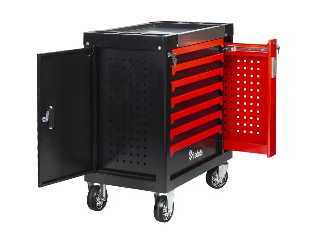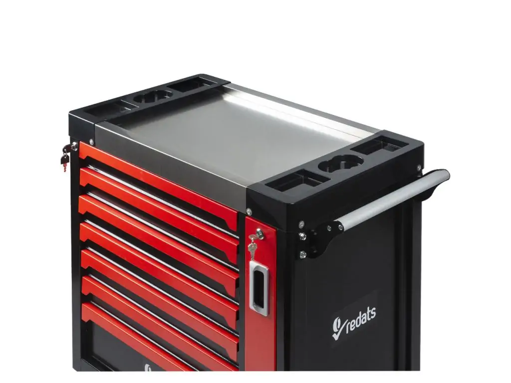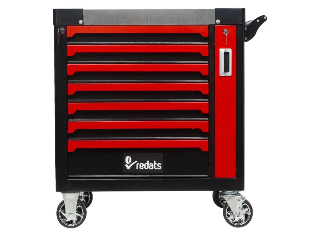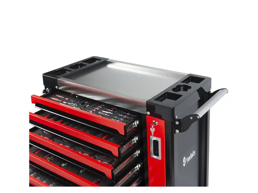 Тележка с инструментом REDATS 7+2 станет отличным приобретением для любой ремонтной мастерской, ведь она удобная, надежная и полностью укомплектована необходимым для работ инструментом в количестве 258 единиц. 7 вместительных ящиков с шарикоподшипниковыми выдвижными механизмами легко открываются, поэтому вы быстро получите доступ к нужным инструментам. Поролоновые ложементы предотвращают смещение инструментов при транспортировке, а центральный замок позволяет одним движением закрыть все ящики. 2 перфорированные стенки, одна из которых выдвижная, а вторая - боковая и закрывается металлической дверцей, позволяют хранить под рукой часто используемый инструмент.