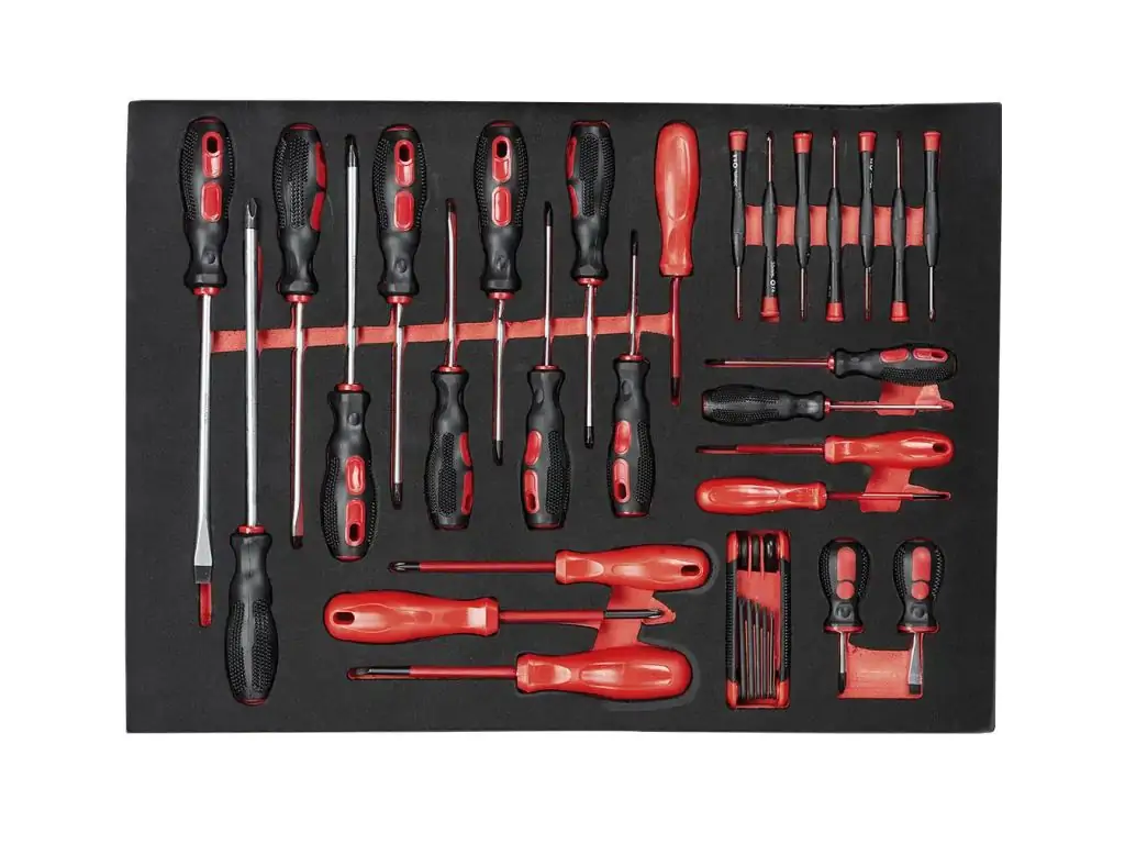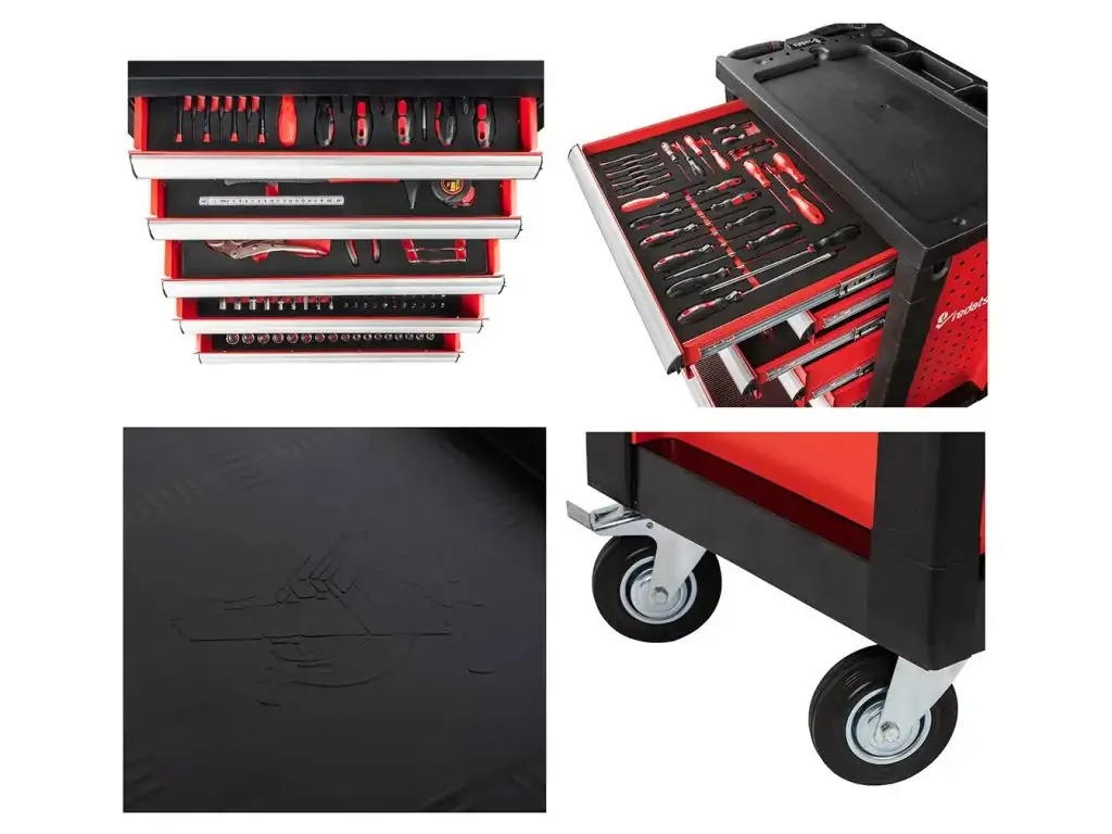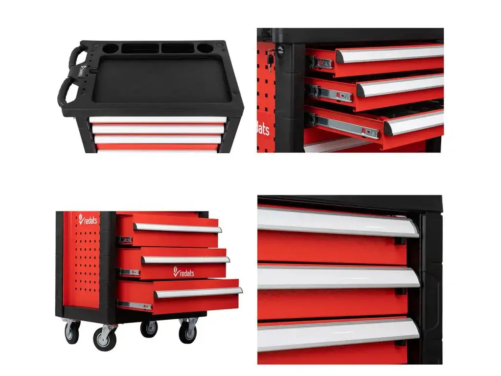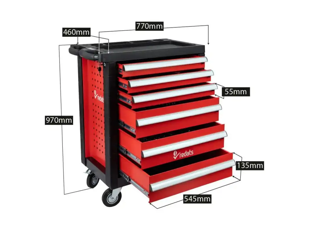 Тележка для мастерской REDATS со 196 профессиональными ручными инструментами – это готовое решение для обустройства рабочего места и оптимизации пространства в мастерской или на СТО. 6 выдвижных ящиков глубиной 400 мм оснащены ложементами для предотвращения смещения и повреждения инструментов. Высота трех верхних ящиков составляет 55 мм, трех нижних ящиков – 135 мм. Пять ящиков заполнены инструментами, рассортированными по типу и назначению. Пустой нижний ящик предназначен для хранения большого инструмента.