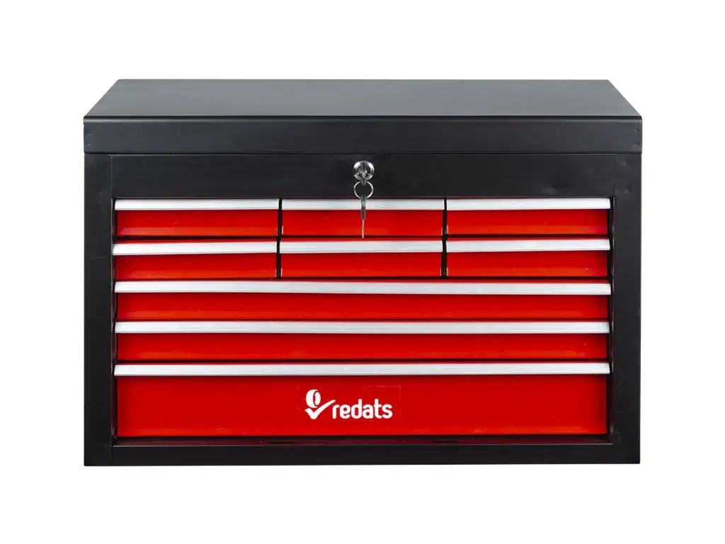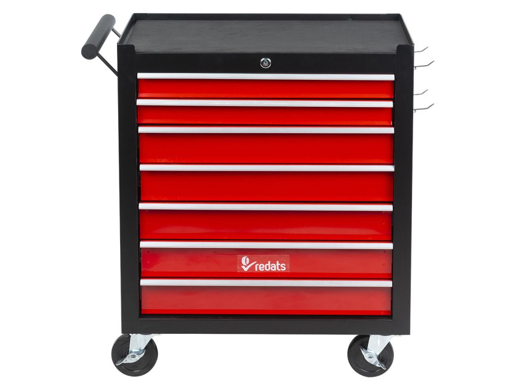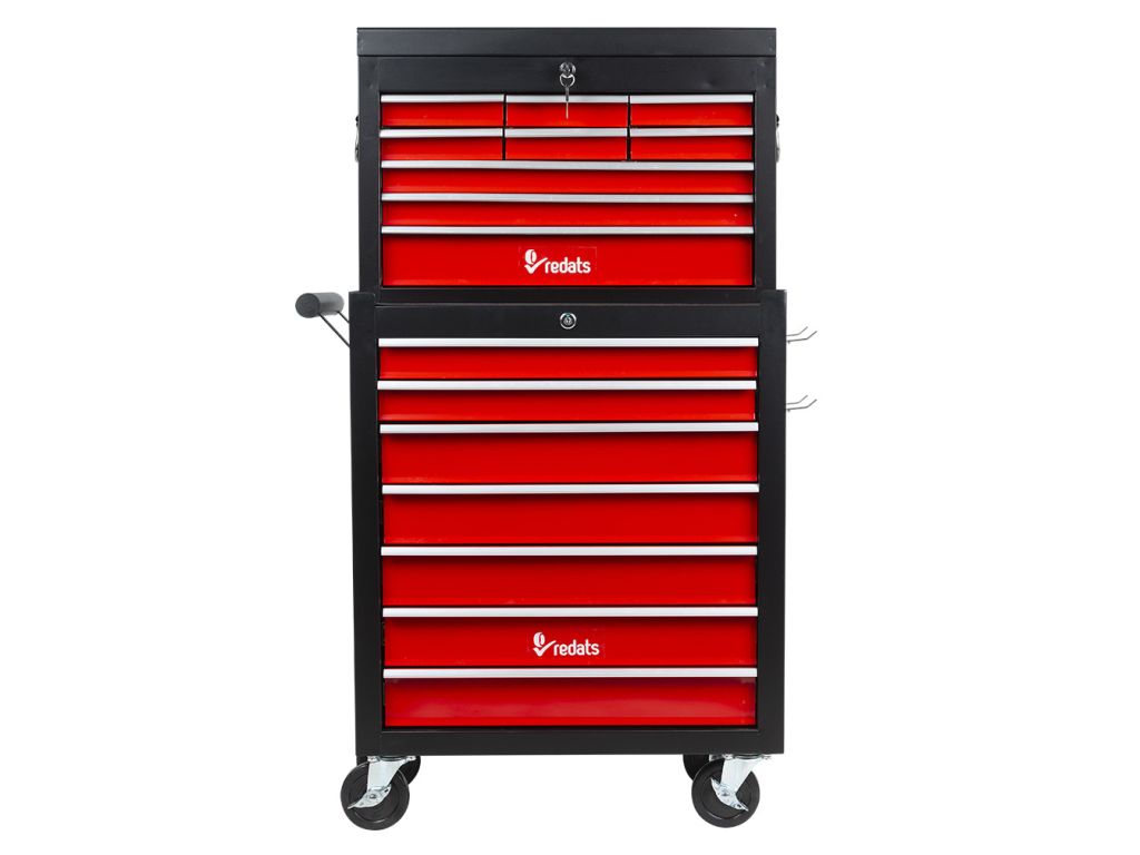 Тележка REDATS COMPACT BLACK - это двухуровневая модульная конструкция для организованного хранения и перемещения инструментов, которая состоит из 2 частей: нижней тележки с 7 вместительными ящиками (2 верхних 511x278x54 мм и 5 нижних 511x278x84 мм) и верхнего бокса с 9 ящиками (6 размером 150x225x40 мм, 2 размером 511x225x40 и 1 размером 511x225x84 мм), который крепится на тележку. Все ящики оснащены направляющими на шариковых подшипниках, что обеспечивает их легкое открывание-закрывание даже при полной загрузке.