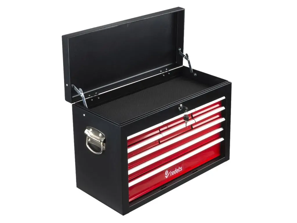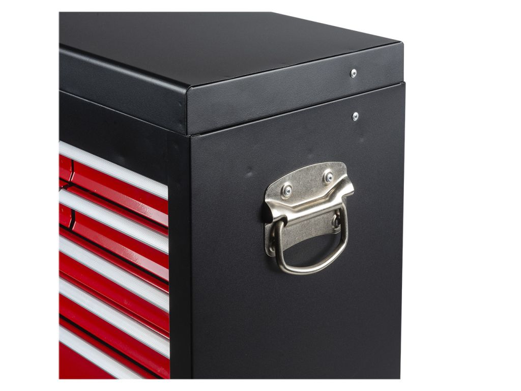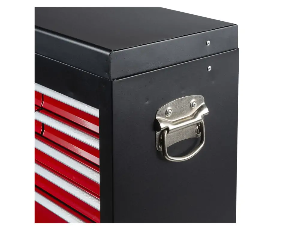 6 ящиков имеют размер 150x225x40 мм, 2 ящика - 511x225x40 мм, а нижний ящик - 511x22 x84 мм. Все ящики легко выдвигаются благодаря высококачественным шариковым подшипникам и закрываются на центральный замок, а поролоновые вставки предотвращают смещение инструмента во время транспортировки. Верхний отсек с откидной крышкой обеспечивает дополнительное место для хранения. Устойчивые к повреждениям и износу материалы изготовления гарантируют, что этот ящик для инструмента будет служить долго и надежно.