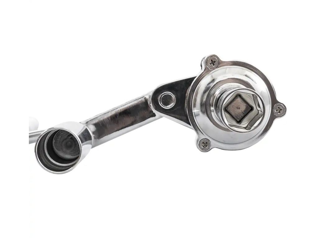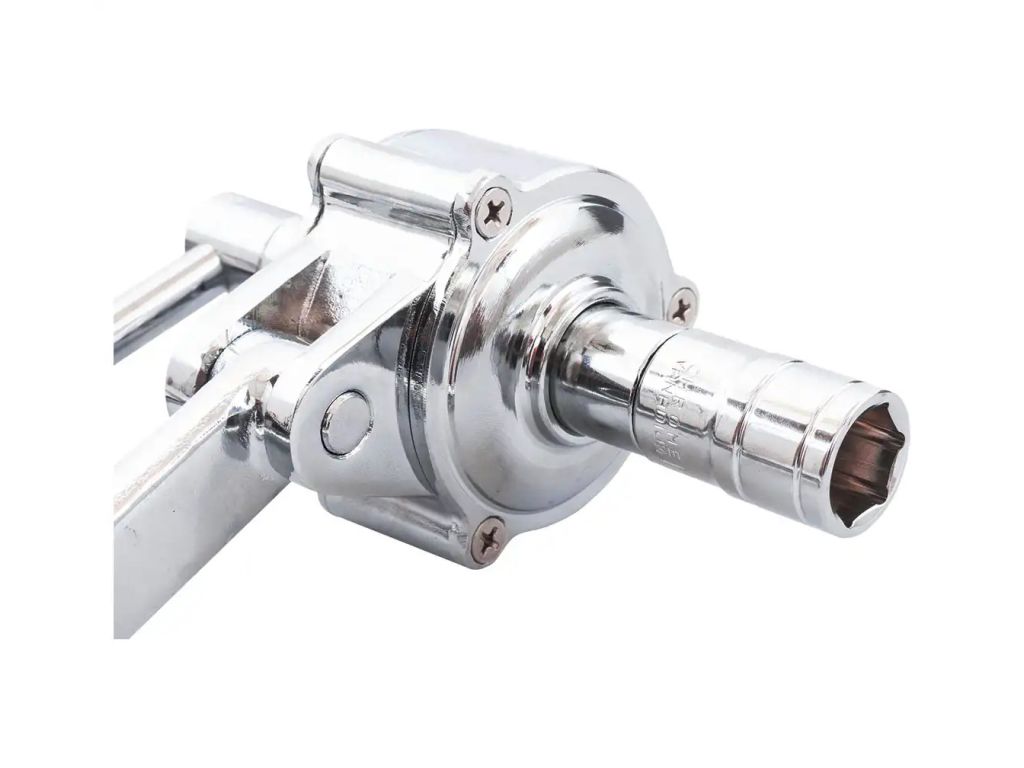 Ключ оснащен кривошипно-шатунным механизмом, работающим в обоих направлениях (влево-вправо), позволяя достигать максимального крутящего момента при небольшом физическом усилии. Корпус изготовлен из качественной хром-ванадиевой стали и обладает высокой стойкостью к деформациям и износу. Во избежание скольжения и смещения ключа во время работы есть специальный блокирующий механизм. В комплект поставки входят насадки 17/19/21 мм, что позволяет эффективно использовать этот ключ для мобильного шиномонтажа.